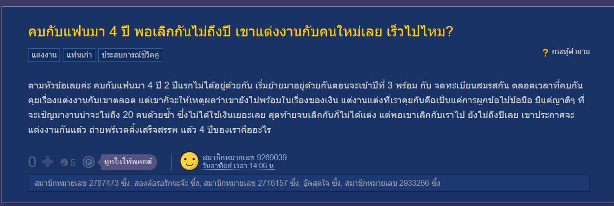 เมื่อวันที่ 18 ก.พ. สมาชิกเว็บไซต์พันทิปรายหนึ่งได้ตั้งกระทู้ระบายความเจ็บปวดหลังยุติความสัมพันธ์กับแฟนหนุ่มที่คบหากันมานานถึง 4 ปี โดยระบุว่า ตลอดเวลาที่คบกันและช่วงที่ย้ายมาอยู่ด้วยกันจนถึงขั้นจดทะเบียนสมรส เธอพยายามพูดเรื่องงานแต่งงานมาตลอด แต่ฝ่ายชายมักอ้างว่า “ยังไม่พร้อมเรื่องเงิน” แม้เธอจะขอเพียงงานเล็กๆ ที่มีแขกไม่ถึง 20 คนก็ตาม