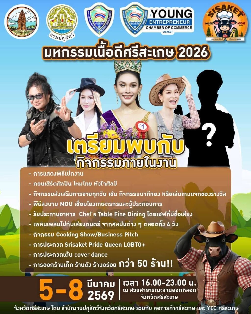ทั้งนี้เป็นการจับคู่ธุรกิจ (Business Matching) และพิธีลงนาม MOU เชื่อมโยงเครือข่าย ชมคอนเสิร์ตจากศิลปินชื่อดัง “ไหมไทย หัวใจศิลป์” การประกวด Sisaket Pride Queen LGBTQ+ การประกวด Cover Dance ดื่มด่ํากับบรรยากาศและการแสดงดนตรีสดที่พร้อมมอบความสุขยาวนานจุใจจนถึงเวลา 23.00 น. “เนื้อดีศรีสะเกษ ศิลปะที่กินได้ จากความใส่ใจของเกษตรกรไทย สู่มาตรฐานสากล”