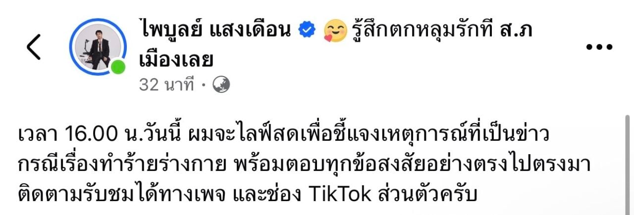 ล่าสุด ครูไพบูลย์ ได้ออกมาเคลื่อนไหวผ่านโซเชียลมีเดีย ด้วยการโพสต์ภาพบริเวณหน้าสถานีตำรวจแห่งหนึ่ง พร้อมระบุข้อความนัดหมายทุกคนเพื่อชี้แจงข้อเท็จจริงทั้งหมดอีกครั้งว่า “เวลา 16.00 น.วันนี้ ผมจะไลฟ์สดเพื่อชี้แจงเหตุการณ์ที่เป็นข่าวกรณีเรื่องทำร้ายร่างกาย พร้อมตอบทุกข้อสงสัยอย่างตรงไปตรงมา ติดตามรับชมได้ทางเพจ และช่อง TikTok ส่วนตัวครับ”