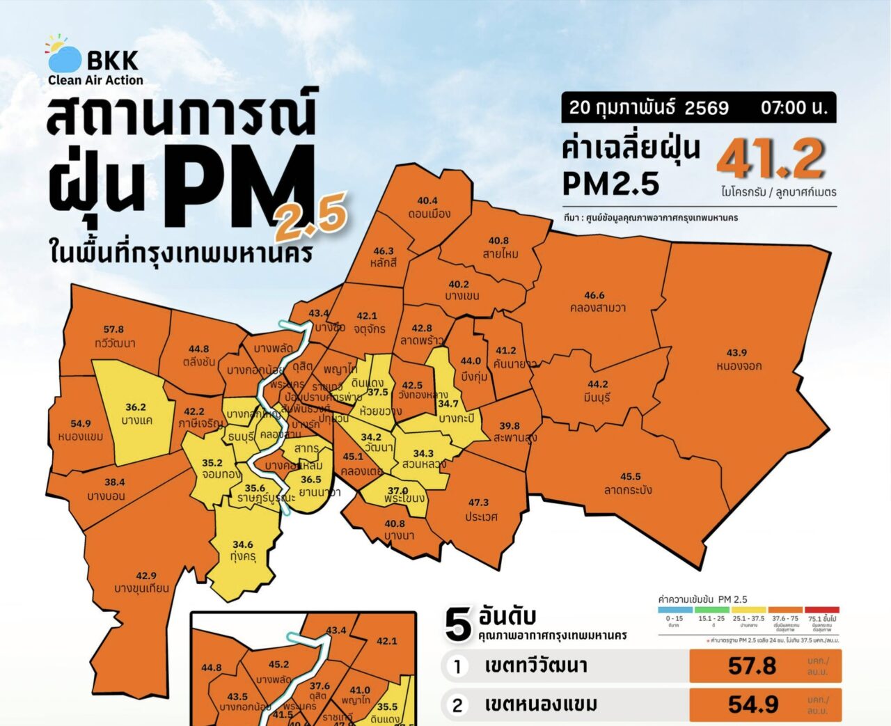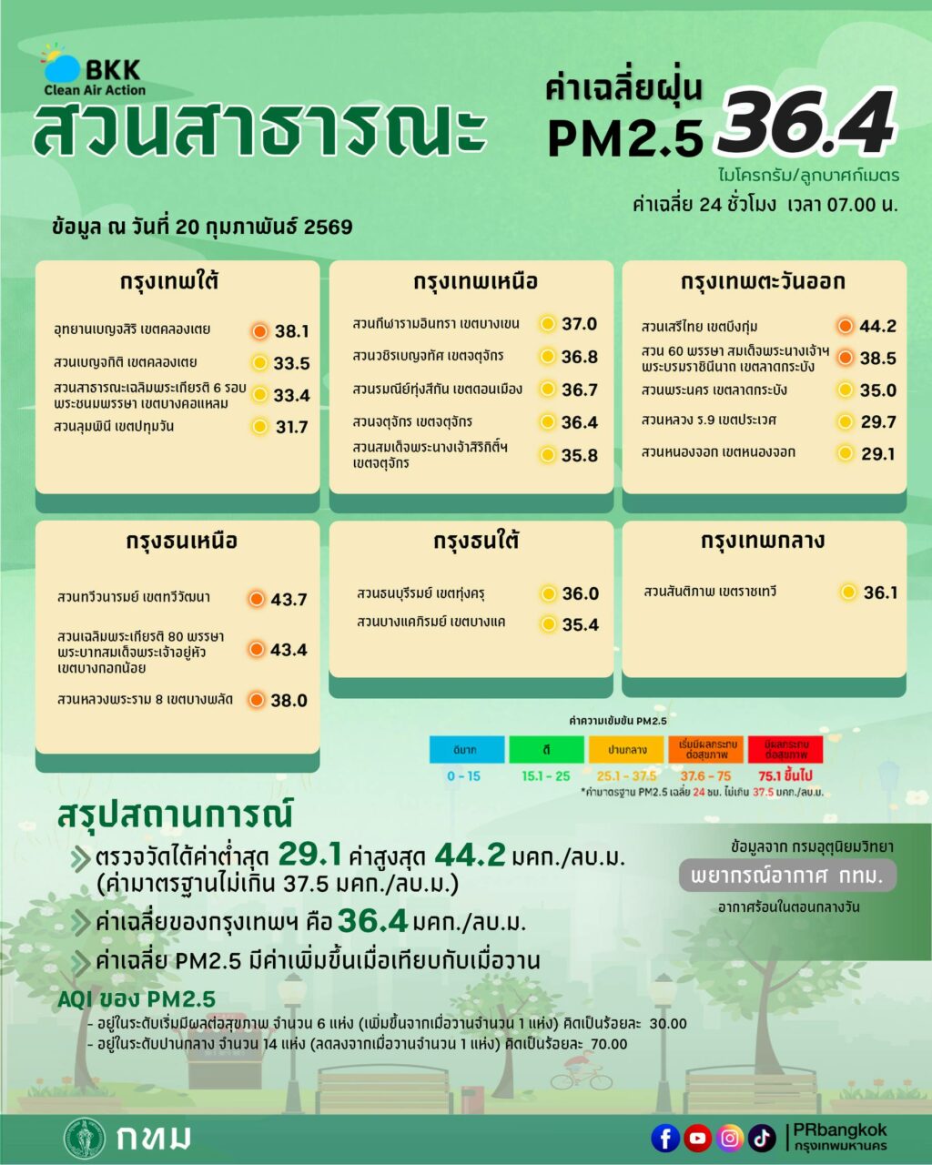เมื่อเวลา 08.35 น. วันที่ 20 ก.พ. ผู้สื่อข่าวรายงานว่า ทีมโฆษกศูนย์ข้อมูลคุณภาพอากาศกรุงเทพมหานคร รายงานสถานการณ์ฝุ่นละอองขนาดไม่เกิน 2.5 ไมครอน (PM 2.5) ของสถานีตรวจวัดคุณภาพอากาศของกรุงเทพมหานคร ประจำวันที่ 20 ก.พ. 69 เวลา 07.00 น. ค่าเฉลี่ย 24 ชั่วโมง ของฝุ่น PM2.5