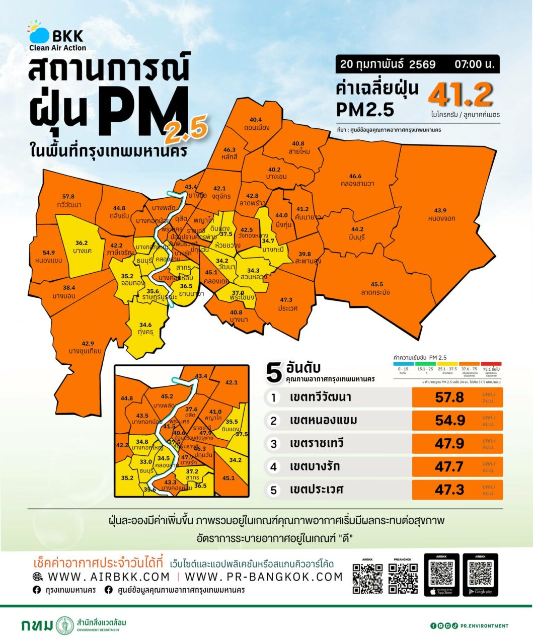 ดัชนีคุณภาพอากาศของสถานีตรวจวัดของกรุงเทพมหานคร ส่วนใหญ่อยู่ในระดับคุณภาพอากาศเริ่มมีผลกระทบต่อสุขภาพ ค่าเฉลี่ยฝุ่นอยู่ที่ 41.2 มคก./ลบ.ม.