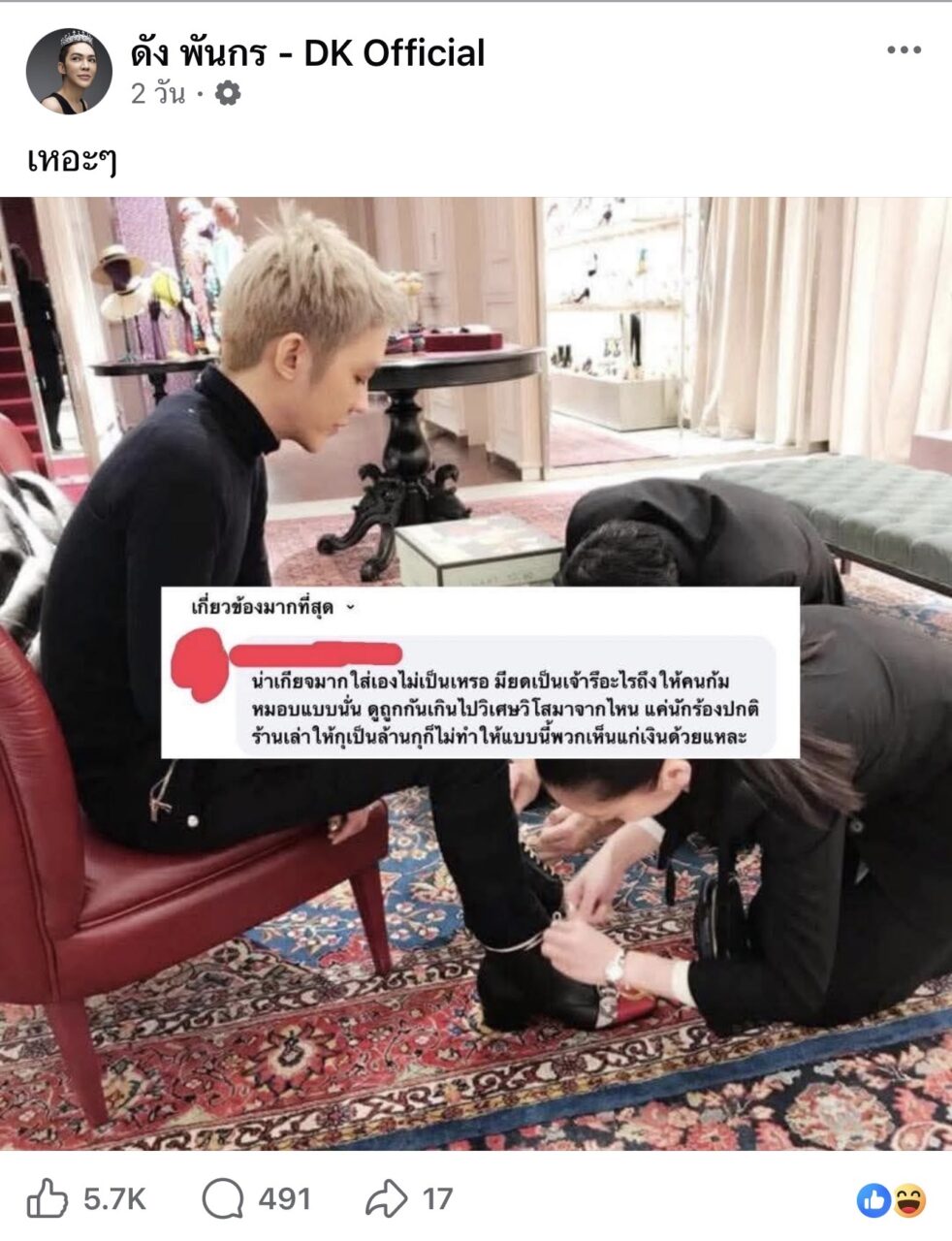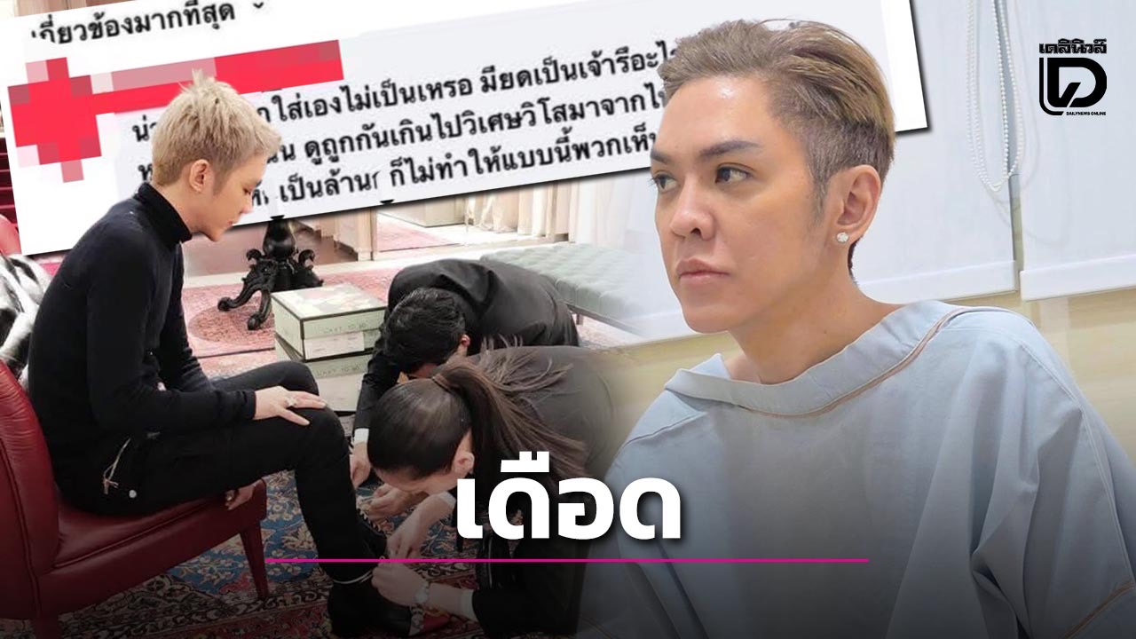 โดยปมดราม่าครั้งนี้ พุ่งเป้าไปที่ภาพที่มีพนักงานในร้านคอยดูแลสวมรองเท้าให้ ซึ่งมีชาวเน็ตรายหนึ่งเข้ามาคอมเมนต์ฉะยับด้วยถ้อยคำรุนแรง ระบุว่า “น่าเกลียดมากใส่เองไม่เป็นเหรอ มียศเป็นเจ้าหรืออะไรถึงให้คนก้มหมอบแบบนั้น ดูถูกกันเกินไปวิเศษวิโสมาจากไหน แค่นักร้องปกติร้านเหล้าให้เป็นล้านก็ไม่ทำให้แบบนี้ พวกเห็นแก่เงินด้วยแหละ” พร้อมลามไปถึงพนักงานและร้านว่าเห็นแก่เงินจนยอมทำเรื่องที่ดูถูกศักดิ์ศรี