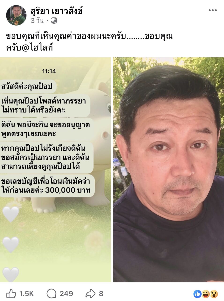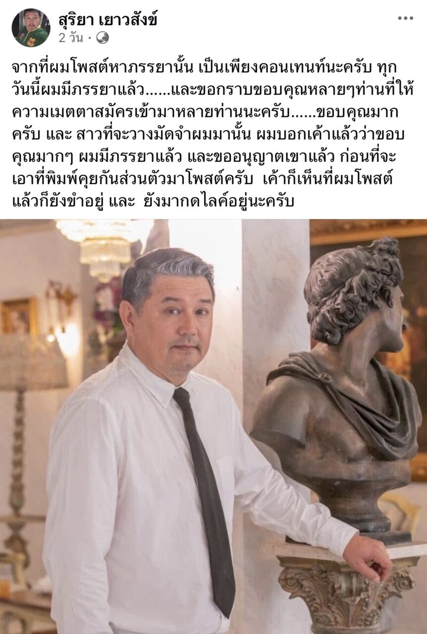 กลายเป็นเรื่องราวสุดพีคที่ทำเอาอดีตพระเอกหน้าหยกอย่าง “ป๊อป-สุริยา เยาวสังข์” ต้องรีบออกมาโพสต์ชี้แจงผ่านเฟซบุ๊กส่วนตัวเป็นการด่วน หลังเจ้าตัวนึกสนุกทำคอนเทนต์โพสต์ประกาศหาภรรยา แต่ดันมีแฟนคลับสาวใจถึงทักแชตมาสมัครแบบจริงจัง ถึงขั้นจะโอนเงินวางมัดจำให้ถึง 3 แสนบาท จนเจ้าตัวต้องรีบเบรกก่อนจะเข้าใจผิดไปกันใหญ่