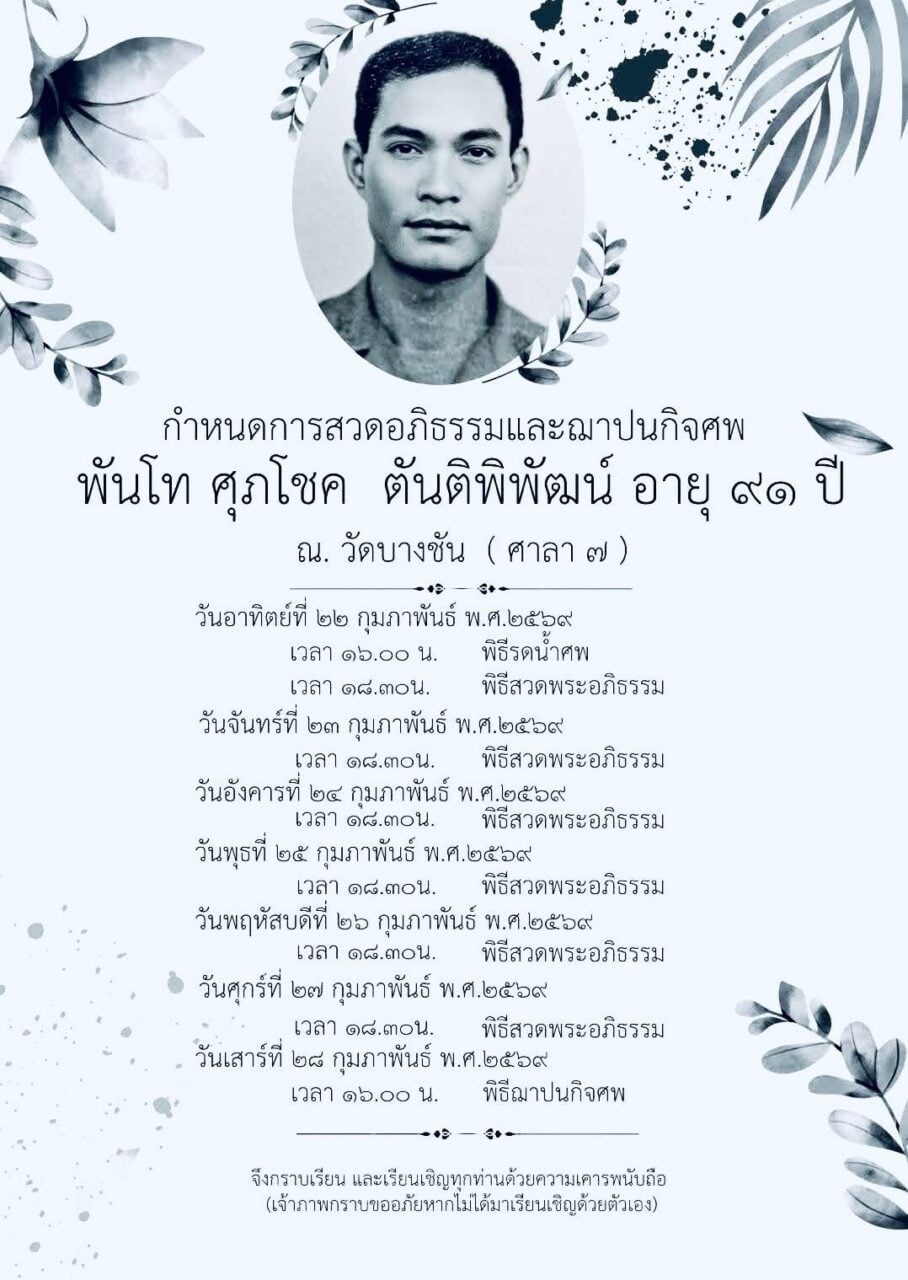 สำหรับพิธีบำเพ็ญกุศล พันโท ศุภโชค ตันติพิพัฒน์ จัดขึ้น ณ วัดบางชัน (ศาลา 7) โดยมีรายละเอียดดังนี้