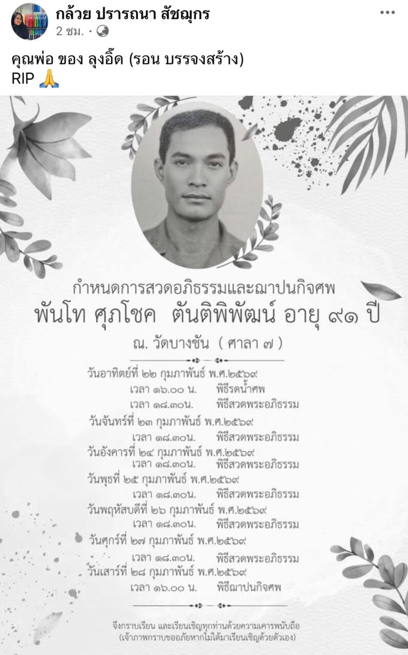 นับเป็นเรื่องราวความสูญเสียครั้งใหญ่ของคนบันเทิง เมื่ออดีตพระเอกและผู้กำกับรุ่นใหญ่ชื่อดัง “อี๊ด-รอน บรรจงสร้าง” หรือถิรยุทธ์ ตันติพิพัฒน์ ต้องสูญเสียคุณพ่อสุดที่รัก “พันโท ศุภโชค ตันติพิพัฒน์” ที่จากไปอย่างสงบด้วยโรคชรา สิริอายุ 91 ปี ท่ามกลางความอาลัยของคนในครอบครัว