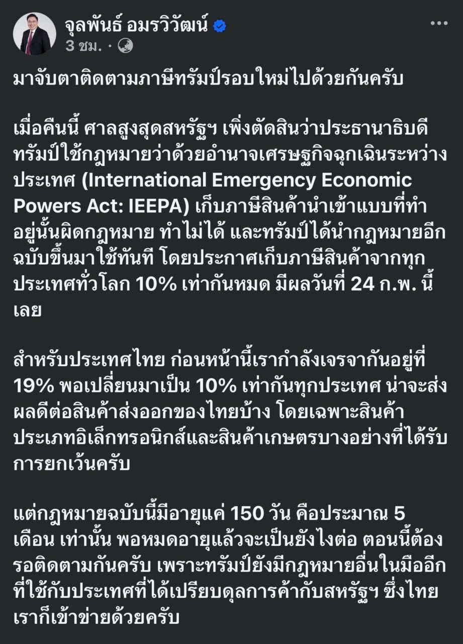 เมื่อวันที่ 21 ก.พ. นายจุลพันธ์ อมรวิวัฒน์ หัวหน้าพรรคเพื่อไทย โพสต์ข้อความผ่านโซเชียลมีเดีย ระบุว่า มาจับตาติดตามภาษีทรัมป์รอบใหม่ไปด้วยกัน เมื่อคืนนี้ ศาลสูงสุดสหรัฐ เพิ่งตัดสินว่าประธานาธิบดีทรัมป์ใช้กฎหมายว่าด้วยอำนาจเศรษฐกิจฉุกเฉินระหว่างประเทศ (International Emergency Economic Powers Act: IEEPA) เก็บภาษีสินค้านำเข้าแบบที่ทำอยู่นั้นผิดกฎหมาย ทำไม่ได้ และทรัมป์ได้นำกฎหมายอีกฉบับขึ้นมาใช้ทันที โดยประกาศเก็บภาษีสินค้าจากทุกประเทศทั่วโลก 10% เท่ากันหมด มีผลวันที่ 24 ก.พ. นี้เลย
