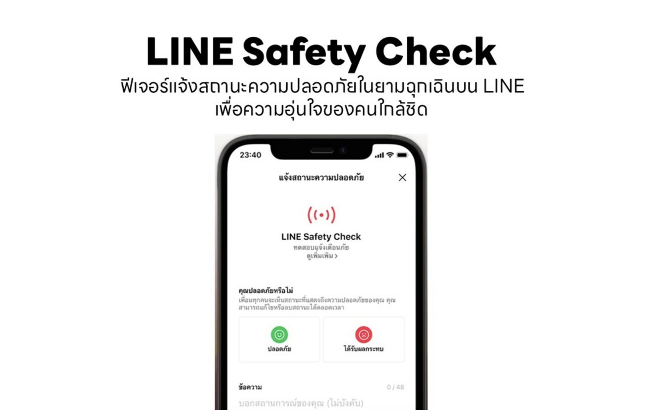 อีกหนึ่งฟีเจอร์ที่สะท้อนบทบาทของ LINE ในฐานะแพลตฟอร์มที่อยู่เคียงข้างคนไทย คือ ‘LINE Safety Check’ ฟีเจอร์เพื่อความปลอดภัยในภาวะภัยพิบัติหรือเหตุฉุกเฉิน ที่พัฒนาร่วมกับหลากหลายหน่วยงานภาครัฐ เพื่อช่วยให้การสื่อสารในช่วงเวลาวิกฤติเป็นเรื่องง่ายและรวดเร็ว