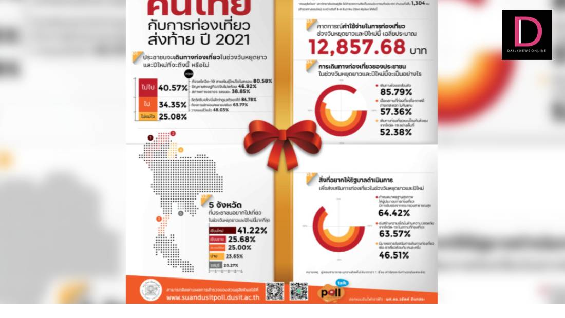 พบว่า ในช่วงวันหยุดยาวและปีใหม่นี้ประชาชนจะไม่เดินทางท่องเที่ยว ร้อยละ 40.57 เพราะกังวลโควิด-19 โอไมครอน และเงินไม่พร้อม ส่วนอีกร้อยละ 34.35 จะไป เพราะฉีดวัคซีนแล้ว มั่นใจว่าดูแลตัวเองได้ จังหวัดที่อยากไปเที่ยวมากที่สุด คือ เชียงใหม่ ร้อยละ 41.22 รองลงมาคือ เชียงราย ร้อยละ 25.68 คาดการณ์ว่าจะใช้จ่ายประมาณ 12,857.68 บาท จะเดินทางด้วยรถยนต์ส่วนตัว ร้อยละ 85.79 เลือกสถานที่ท่องเที่ยวที่อากาศดี ถ่ายเทสะดวก ไม่คับแคบ ร้อยละ 57.36
