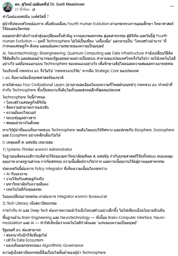 โดยเจ้าของโพสต์ ระบุข้อความว่า “ทำไมต้องยศชนัน วงศ์สวัสดิ์ ผู้นำที่ประเทศไทยต้องการ เพื่อขับเคลื่อน Fourth Human Evolution ผ่านกระทรวงการอุดมศึกษา วิทยาศาสตร์ วิจัยและนวัตกรรม มนุษยชาติกำลังก้าวเข้าสู่จุดเปลี่ยนครั้งสำคัญ จากยุคเกษตรกรรม สู่อุตสาหกรรม สู่ดิจิทัล และวันนี้สู่ Fourth Human Evolution – ยุคที่ Technosphere ไม่ได้เป็นเพียง “เครื่องมือ” แต่กลายเป็น “โครงสร้างอำนาจ” ที่กำหนดเศรษฐกิจ สังคม และแม้แต่ความหมายของความเป็นมนุษย์ AI, Neurotechnology, Bioengineering, Quantum Computing และ Data Infrastructure กำลังเปลี่ยนวิธีคิด วิธีตัดสินใจ และสมดุลอำนาจของรัฐและตลาดอย่างเป็นระบบ คำถามของประเทศไทยจึงไม่ใช่ว่า จะใช้เทคโนโลยีอย่างไร แต่คือจะออกแบบ Technosphere ของตนเองอย่างไร เพื่อรักษาอธิปไตยและความสมดุลทางอารยธรรม”