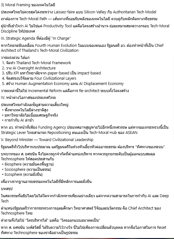 “Strategic Agenda ที่ต้องมีผู้ “In Charge” หากไทยจะขับเคลื่อน Fourth Human Evolution ในแบบของตนเอง รัฐมนตรี อว. ต้องทำหน้าที่เป็น Chief Architect of Thailand’s Tech-Moral Civilization”