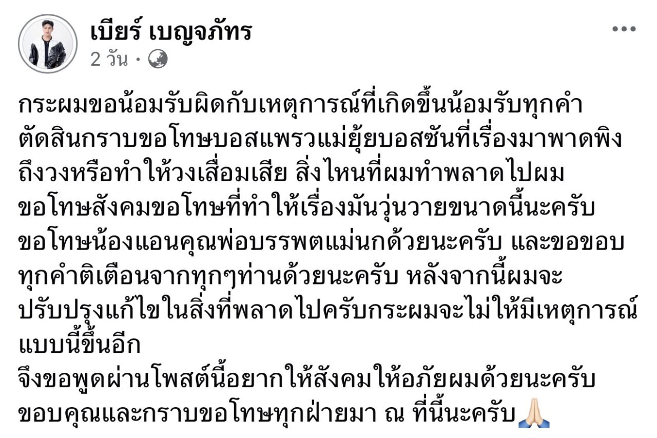 ขณะที่ทางด้านหนุ่ม “เบียร์ เบญจภัทร” ก็ไม่อยู่เฉย รีบออกมาเคลื่อนไหวผ่านโพสต์ส่วนตัวขอน้อมรับผิดกับสิ่งที่เกิดขึ้นทั้งหมด พร้อมกราบขอโทษบอสแพรวพราว แม่ยุ้ย และบอสซัน ที่ทำให้ชื่อเสียงของวงต้องมัวหมอง รวมถึงส่งข้อความขอโทษไปถึง “น้องแอน” และครอบครัวของฝ่ายหญิงที่ทำให้เรื่องราววุ่นวายขนาดนี้ โดยเจ้าตัวยืนยันว่าจะนำคำติชมไปปรับปรุงแก้ไขและสัญญาว่าจะไม่ให้เกิดเหตุการณ์เช่นนี้ขึ้นอีก พร้อมวิงวอนขอให้สังคมให้อภัยในสิ่งที่พลาดพลั้งไป