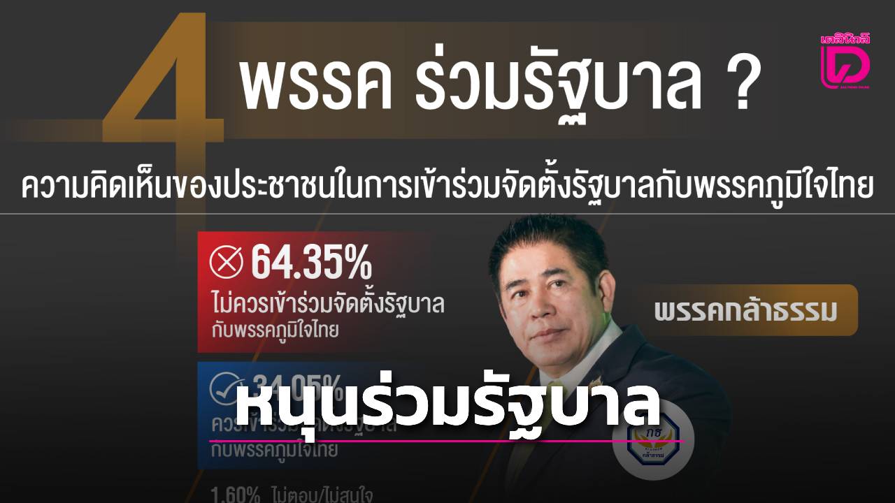 จากการสำรวจ เมื่อถามความคิดเห็นของประชาชนต่อพรรคกล้าธรรมในการเข้าร่วมจัดตั้งรัฐบาลกับพรรคภูมิใจไทย พบว่า ร้อยละ 64.35 ระบุว่า ไม่ควรเข้าร่วมจัดตั้งรัฐบาล รองลงมา ร้อยละ 34.05 ระบุว่า ควรเข้าร่วมจัดตั้งรัฐบาล และร้อยละ 1.60 ระบุว่า ไม่ตอบ/ไม่สนใจ