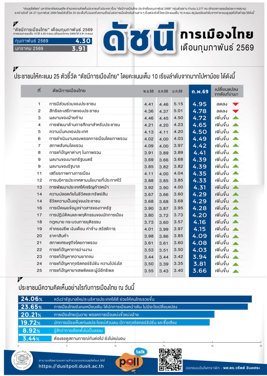 เมื่อวันที่ 1 มี.ค.ศูนย์สำรวจความคิดเห็น “สวนดุสิตโพล” มหาวิทยาลัยสวนดุสิต สำรวจความคิดเห็นประชาชนทั่วประเทศ เรื่อง “ดัชนีการเมืองไทย ประจำเดือนกุมภาพันธ์ 2569” จากกลุ่มตัวอย่างจำนวน 2,277 คน (สำรวจทางออนไลน์และภาคสนาม) ระหว่างวันที่ 24–27 กุมภาพันธ์ 2569