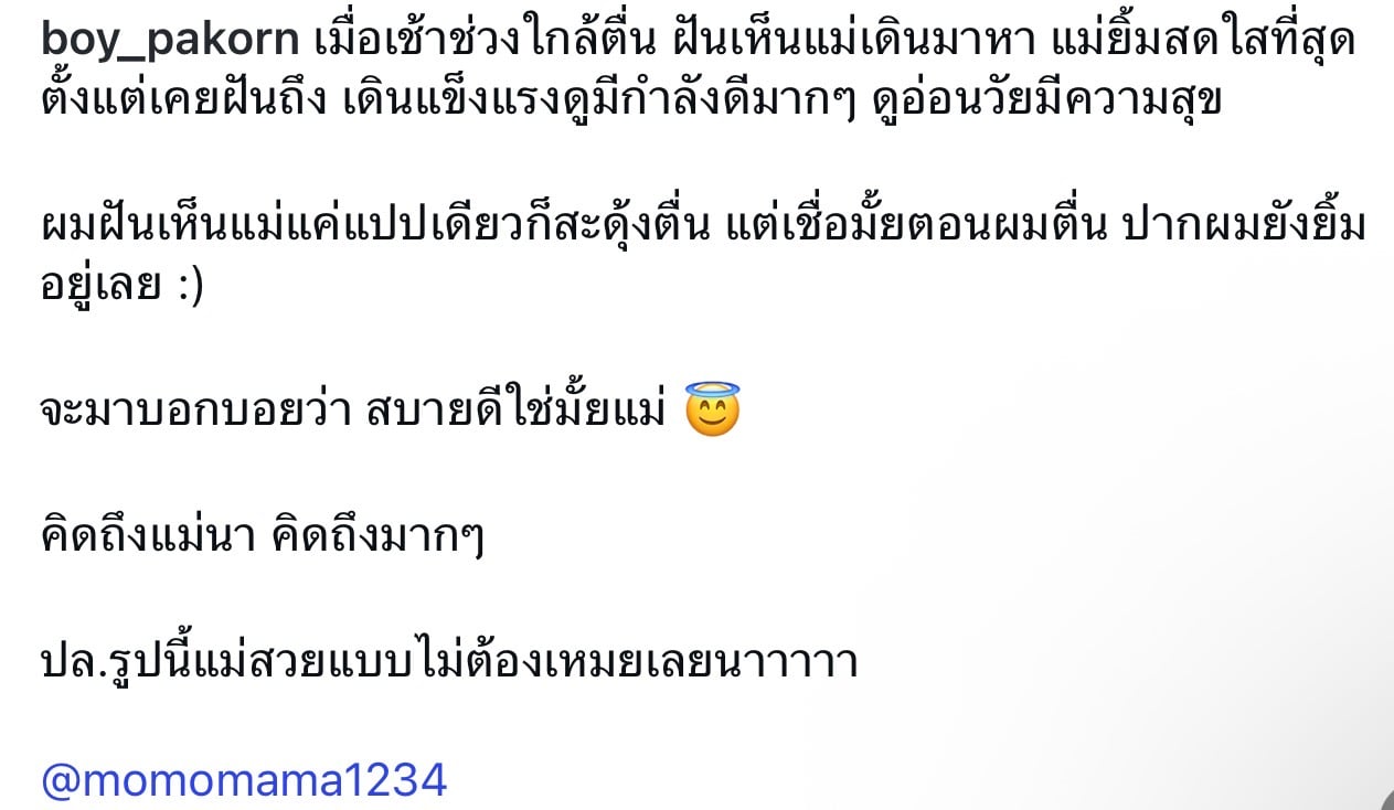 โดย บอย ปกรณ์ เผยว่า “ล่าสุดฝันเห็นแม่แล้วบอกว่าแม่ยิ้มสวยที่สุด ความจริงผมก็ฝันถึงแม่บ้าง แค่ว่ารอบล่าสุดมันเป็นฝันที่เราเห็นแม่ในเวอร์ชั่นที่สดใสที่สุดเท่าที่เคยฝันมา เราไม่ได้เห็นเขาในโหมดนี้มานาน เพราะว่าแม่ก็ไม่สบายอยู่นาน จำได้ว่าเขาใส่เสื้อโปโล ใส่แว่น เดินเร็วๆ คล่องๆ หน้าเหมือนย้อนวัยไปเมื่อ 10 ปีที่แล้ว รู้สึกว่าเขามาในโหมดที่ดูสดใสแข็งแรง แต่เสียดายที่ว่าฝันเห็นแป๊บเดียว เขาเดินผ่านมุมอะไรออกมาไม่รู้ หลังจากนั้นเราก็สะดุ้งตื่นเลยว่าแม่เดินมา เราก็ยิ้มกว้าง ตื่นมาก็ยังยิ้มอยู่ คือมันตื่นเลยทันที เราก็คิดเข้าข้างตัวเองว่าเขาคงมาบอกว่าเขาสบายดี จริงๆ ผมฝันถึงแม่เรื่อยๆ บางทีก็ฝันเป็นเรื่องเป็นราว แต่ปะติดปะต่อไม่ค่อยได้ จำได้แค่ว่าฝันถึง แต่ว่ารอบนี้ฝันก่อนตื่นไงก็เลยเห็นภาพชัดเลย
