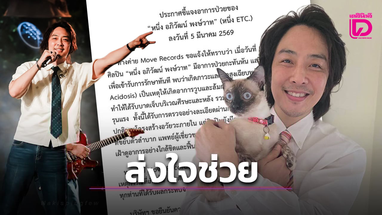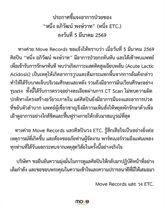 ทำเอาเหล่าบรรดาแฟนคลับและคนบันเทิงต่างพากันส่งกำลังใจให้รัวๆ สำหรับนักร้องหนุ่มชื่อดัง “หนึ่ง อภิวัฒน์ พงษ์วาท” หรือ “หนึ่ง ETC” ที่ล่าสุดทางต้นสังกัดอย่างค่าย Move Records ได้ออกมาแจ้งข่าวอาการป่วยสุดระทึกของศิลปินหนุ่มในวันนี้ (5 มีนาคม 2569)