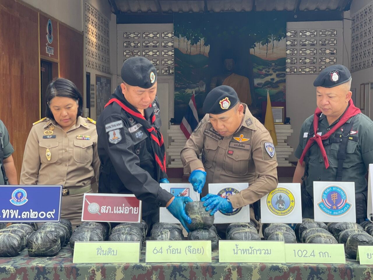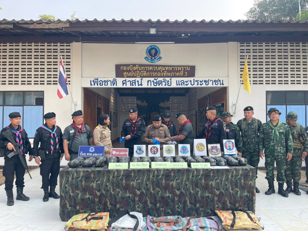 จากการตรวจสอบพื้นที่โดยรอบภายหลังเสียงปืนสงบลง เจ้าหน้าที่พบกระเป๋าเป้ดัดแปลงที่กลุ่มคนร้ายทิ้งไว้จำนวนมาก ภายในบรรจุฝิ่นดิบน้ำหนักรวมประมาณ 102.4 กิโลกรัม จึงได้ดำเนินการตรวจยึดของกลางทั้งหมดส่งพนักงานสอบสวนดำเนินการตามกฎหมาย พร้อมประสานกำลังเพิ่มเติมเพื่อขยายผลและเพิ่มความเข้มข้นในการลาดตระเวนตามแนวตะเข็บชายแดนเพื่อป้องกันการลักลอบนำเข้ายาเสพติดในช่วงสถานการณ์นี้อย่างต่อเนื่อง
