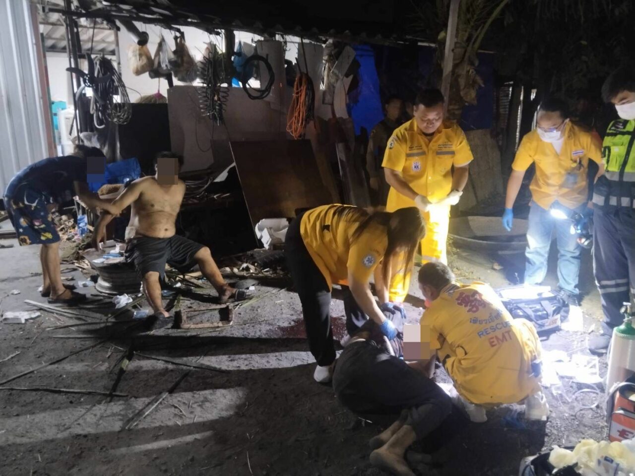 ที่เกิดเหตุพบผู้บาดเจ็บ 2 ราย นอนอยู่คนละจุดภายในบริเวณบ้าน รายแรกทราบชื่อ นายกิติชัย อายุ 28 ปี ถูกของมีคมฟันเข้าที่บริเวณท้ายทอยและลำตัว อาการสาหัส ส่วนอีกรายทราบชื่อ นายนันทภพ อายุ 36 ปี ถูกยิงด้วยอาวุธปืนเข้าที่บริเวณช่องท้อง บาดเจ็บสาหัสเช่นกัน เจ้าหน้าที่หน่วยกู้ภัยได้เร่งให้การปฐมพยาบาลเบื้องต้น ก่อนประสานทีมแพทย์จากโรงพยาบาลแหลมฉบังเข้าช่วยเหลือ และรีบนำตัวผู้บาดเจ็บทั้งสองรายส่งโรงพยาบาลใกล้เคียงเพื่อให้แพทย์ทำการรักษาอย่างเร่งด่วน ใกล้กันพบอาวุธปืนไทยประดิษฐ์ 1 กระบอก และมีดตัดอ้อยตกอยู่ในที่เกิดเหตุ