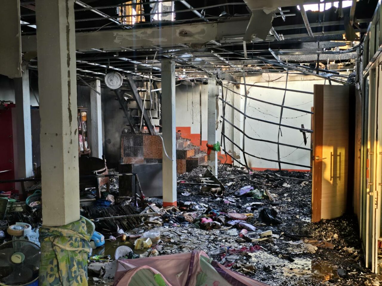ที่เกิดเหตุพบไฟกำลังลุกไหม้บ้านสองชั้นครึ่งปูนครึ่งไม้ เลขที่ 131 หมู่ที่ 15 บ้านโคกสะอาด ต.หินโคน อ.ลำปลายมาศ จ.บุรีรัมย์ อย่างรุนแรง รถดับเพลิงหลายคันพยายามระดมฉีดน้ำดับไฟ แต่เป็นไปด้วยความลำบาก เนื่องจากต้นเพลิงอยู่บริเวณชั้นสองของบ้านซึ่งเป็นไม้ทั้งหมด ใช้เวลาประมาณ 40 นาที จึงสามารถระงับเพลิงไว้ได้ แต่บ้านเสียหายหมดทั้งหลัง
