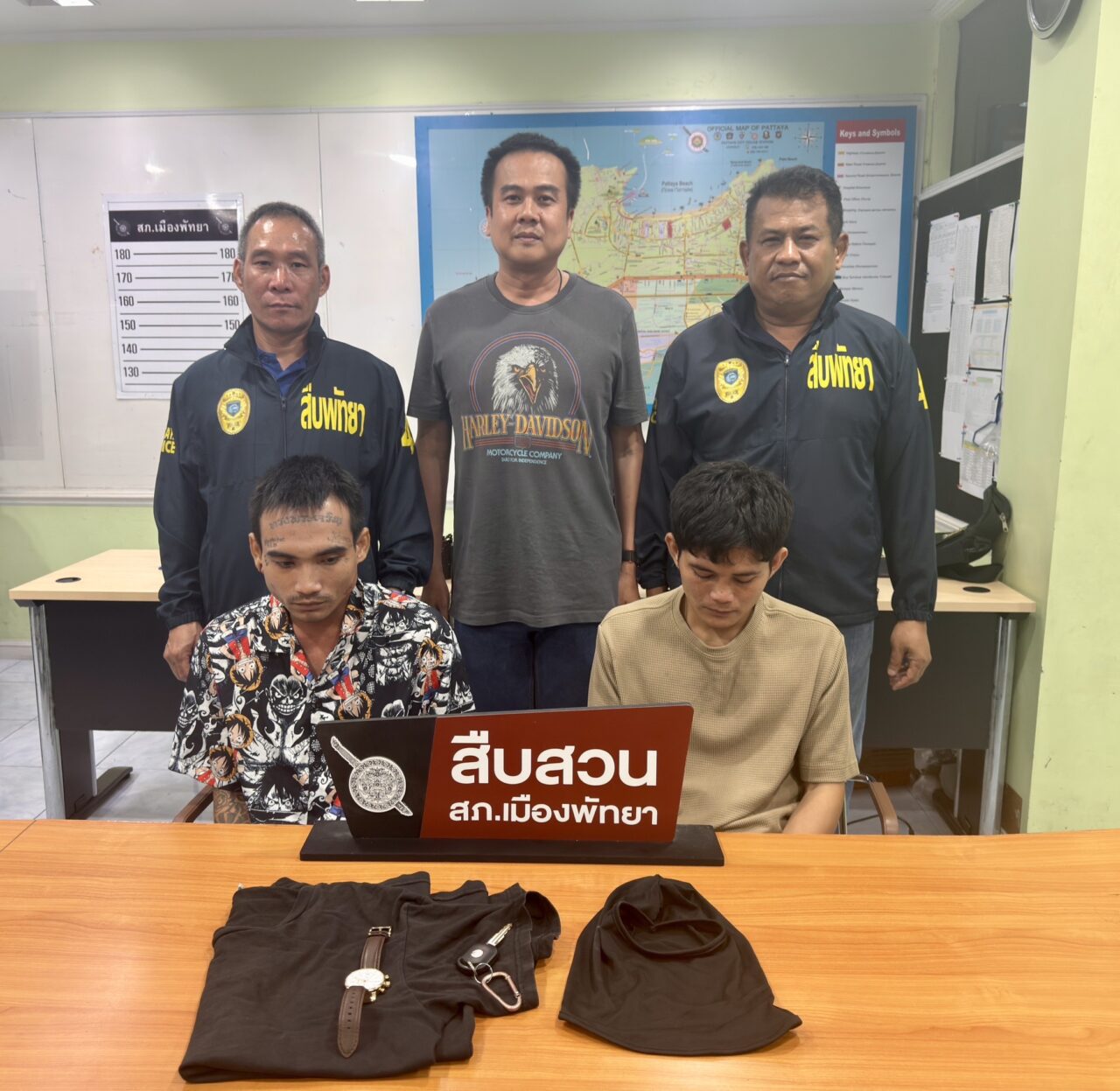 เมื่อวันที่ 9 มี.ค. 69 เจ้าหน้าที่ตำรวจ สภ.เมืองพัทยา ภายใต้การอำนวยการของ พ.ต.อ.เอนก สระทองอยู่ ผกก.สภ.เมืองพัทยา พร้อมด้วย พ.ต.ท.อรุษ สภานนท์ รอง ผกก.สส. พ.ต.ท.สุรเดช อิ่มใจ สว.สส. และ ร.ต.อ.ดอกรัก สายโรจน์ รอง สว.สส. ได้นำกำลังเจ้าหน้าที่ชุดสืบสวนเข้าจับกุมตัวผู้ต้องหาคดีลักทรัพย์ภายในบ้านพักหรูบริเวณเขาพระตำหนัก เมืองพัทยา ได้จำนวน 2 ราย คือ นายกฤษพงษ์ บุญจันทร์ อายุ 26 ปี และนายนครินทร์ เข็มทิศ อายุ 28 ปี พร้อมตรวจยึดของกลางเป็นรถยนต์เก๋งยี่ห้อ Chevrolet สีดำ ทะเบียน ขว 9273 ระยอง ซึ่งใช้เป็นพาหนะในการก่อเหตุและหลบหนี รวมถึงเสื้อผ้าที่ใช้สวมใส่ในวันก่อเหตุ