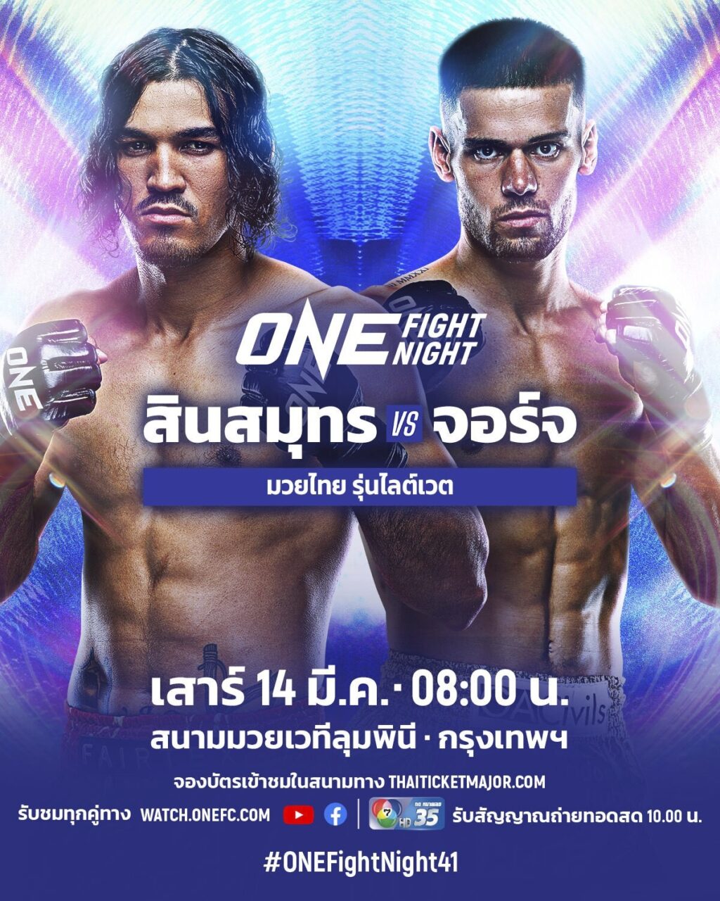 แฟนกีฬาชาวไทยสามารถรับชมการถ่ายทอดสดศึก ONE Fight Night 41 ทาง Watch.ONEFC.com (บางประเทศ), Facebook & YouTube ONE (บางประเทศ) คู่แรกเริ่มเวลา 8.00 น. และทางช่อง 7HD กด 35 (ภาษาไทย) เริ่ม 10.00 น. จองบัตรเข้าชมในสนามผ่านทาง THAI TICKET MAJOR