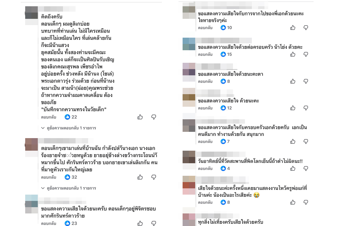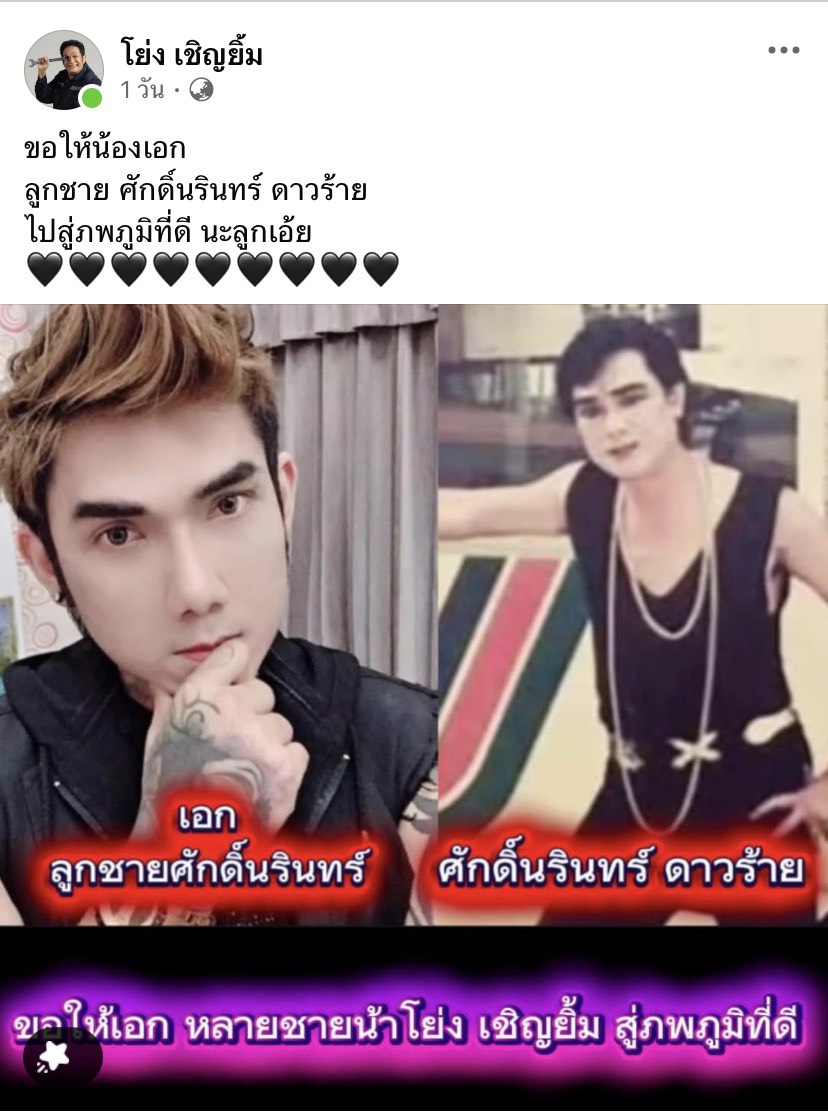 โดยน้าโย่งได้เขียนข้อความว่า “ขอให้น้องเอก ลูกชาย ศักดิ์นรินทร์ ดาวร้าย ไปสู่ภพภูมิที่ดี นะลูกเอ้ย” ซึ่งก็มีแฟนๆมากดไลก์และแสดงความอาลัย พร้อมบอกขอให้น้องไปสู่ภพภูมิที่ดีอีกด้วย