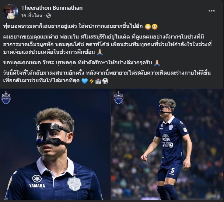 ธีราทร บุญมาทัน ดาวเตะทีมบุรีรัมย์ ยูไนเต็ด กลับมาลงสนามอีกครั้งในเกมที่ “ปราสาทสายฟ้า” ถล่ม ชลบุรี เอฟซี ยับเยิน 5-0 หลังได้รับบาดเจ็บจมูกหักเกมเอเอฟซี แชมเปี้ยนส์ลีก อีลิต 2025-26 รอบลีกเฟส นัดสุดท้าย เมื่อกลางเดือนกุมภาพันธ์ที่ผ่านมา จากการโดนแขนของนักเตะ เซี่ยงไฮ้ เสิ่นหัว ฟาดเข้าไปที่จมูก