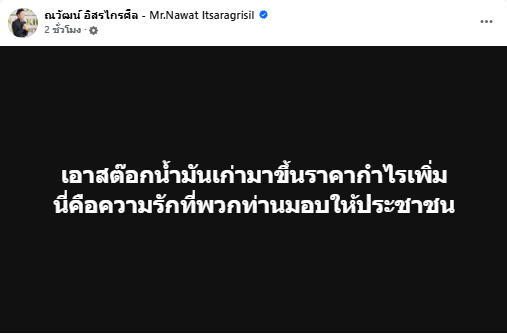 โดย ณวัฒน์ ระบุข้อความว่า “เอาสต๊อกน้ำมันเก่ามาขึ้นราคากำไรเพิ่ม นี่คือความรักที่พวกท่านมอบให้ประชาชน”