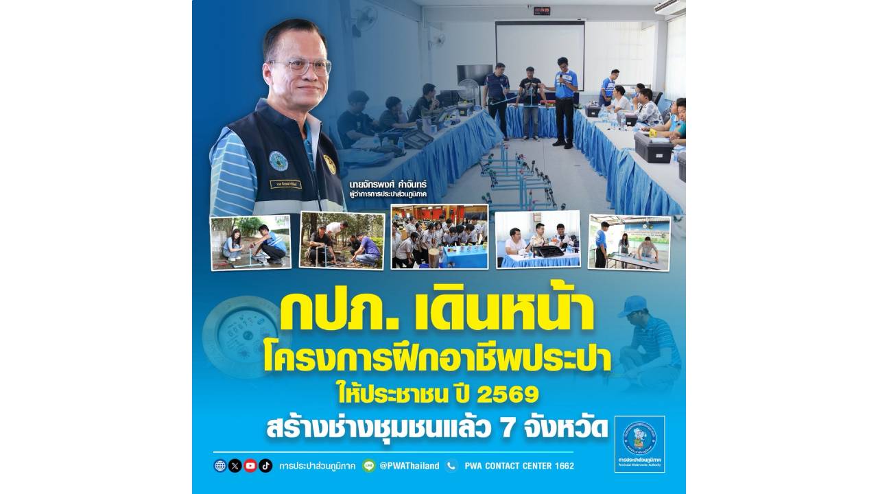 นายจักรพงศ์ คำจันทร์ ผู้ว่าการการประปาส่วนภูมิภาค (กปภ.) เปิดเผยว่า ได้ดำเนินโครงการ “ฝึกอาชีพประปาให้ประชาชน” ประจำปี 2569 ต่อเนื่องเป็นปีที่ 4 โดยมีเป้าหมายเพื่อส่งเสริมความรู้และทักษะด้านงานประปาให้แก่ประชาชน ภายใต้หลักสูตร “การสำรวจ ติดตั้ง ซ่อมแซมท่อประปาในที่พักอาศัยและอาคารสำนักงาน” เพื่อให้สามารถนำความรู้ไปต่อยอดเป็นอาชีพเสริม สร้างรายได้ และลดภาระค่าใช้จ่ายในการซ่อมแซมระบบประปาภายในครัวเรือน ปัจจุบันโครงการมีความคืบหน้าอย่างเป็นรูปธรรม โดยได้รับความร่วมมือจากกรมพัฒนาฝีมือแรงงาน และสำนักงานคณะกรรมการการอาชีวศึกษาเป็นอย่างดี ล่าสุด กปภ. ได้จัดฝึกอบรมแล้ว ในหลายพื้นที่ ได้แก่ วิทยาลัยเทคนิคตราด จังหวัดตราด, วิทยาลัยเทคนิคอ่างทอง จังหวัดอ่างทอง, สำนักงานพัฒนาฝีมือแรงงานนครนายก จังหวัดนครนายก, สำนักงานพัฒนาฝีมือแรงงานมหาสารคาม จังหวัดมหาสารคาม สถาบันพัฒนาฝีมือแรงงาน 42 หนองคาย จังหวัดหนองคาย และ สถาบันพัฒนาฝีมือแรงงาน 7 อุบลราชธานี จังหวัดอุบลราชธานี และวิทยาลัยเทคนิคเลย จังหวัดเลย ทั้งนี้ ตั้งแต่เริ่มโครงการในปี 2569 มีประชาชนผ่านการฝึกอบรมและได้รับใบประกาศนียบัตรแล้ว จำนวน 137 คน และมีพนักงาน กปภ. ร่วมเป็นวิทยากรและผู้สนับสนุนโครงการ จำนวน 44 คน สำหรับแผนการดำเนินงานในระยะต่อไป กปภ. มีกำหนดการจัดฝึกอบรมในอีกหลายจังหวัดทั่วประเทศ อาทิ จันทบุรี สุพรรณบุรี ประจวบคีรีขันธ์ กระบี่ พังงา ชัยภูมิ สุรินทร์ เลย แพร่ พะเยา นครสวรรค์ สุโขทัย ปัตตานี และนราธิวาส เพื่อให้ประชาชนในทุกภูมิภาคเข้าถึงองค์ความรู้ด้านงานประปา ต่อยอดการสร้างอาชีพ สร้างรายได้ให้ตนเองและครอบครัว โดยมีกำหนดดำเนินการต่อเนื่องไปจนถึงเดือนมิถุนายน 2569
