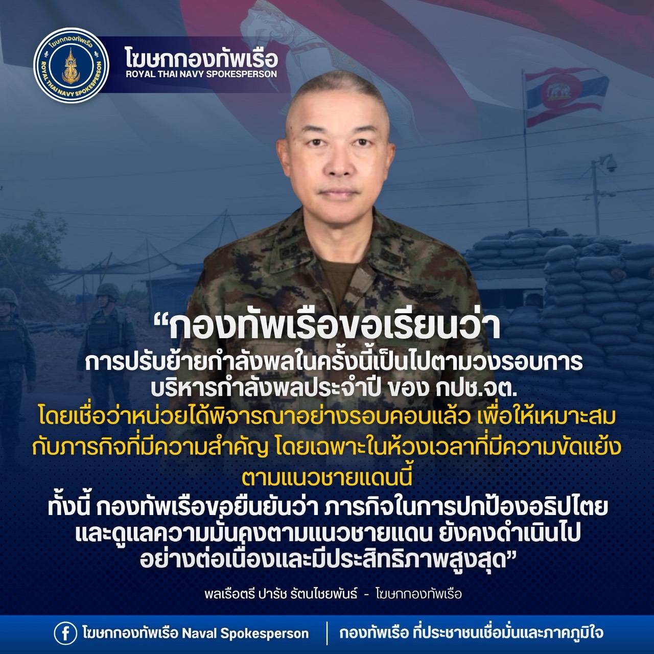 เกี่ยวกับกรณีดังกล่าว พล.ร.ต.ปารัช รัตนไชยพันธ์ โฆษกกองทัพเรือ เปิดเผยว่า กรณีการสลับเปลี่ยนตำแหน่ง โยกย้ายการบริหารจัดการภายในนั้น หลายคนน่าจะเห็นคำสั่งแต่งตั้งแล้ว ซึ่งจะเห็นได้ว่ามีตำแหน่งที่สลับเปลี่ยนเยอะมาก เนื่องจากกองทัพเรือมีนโยบาย ให้ข้าราชการในสังกัด เกษียณอายุก่อนเวลากำหนด ทำให้มีหลายท่านเข้าโครงการนี้ ส่งผลให้มีตำแหน่งที่จะว่างเพิ่มขึ้นหลายตำแหน่ง สอดคล้องกับช่วงไทม์ไลน์การโยกย้าย จะเกิดขึ้นในช่วงวันที่ 1 เมษายน และ 1 ตุลาคม ของทุกปี ยืนยันได้ว่าเป็นเรื่องปกติในการบริหารจัดการบุคลากร ตามความเหมาะสมของผู้บัญชาการเห็นชอบ