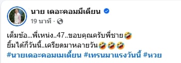 ทางด้านน้องชายคนสนิทอย่าง “นาย เดอะคอมเมเดี้ยน” ได้ออกมาโพสต์ข้อความผ่านโซเชียลส่วนตัวด้วยความดีใจ ระบุว่า “เต็มข้อ…พี่เหน่ง..47..ขอบคุณครับพี่ชาย ยิ้มได้ก็วันนี้..เครียดมาหลายวัน #นายเดอะคอมเมเดี้ยน #เทรนมาแรงวันนี้ #หวย”