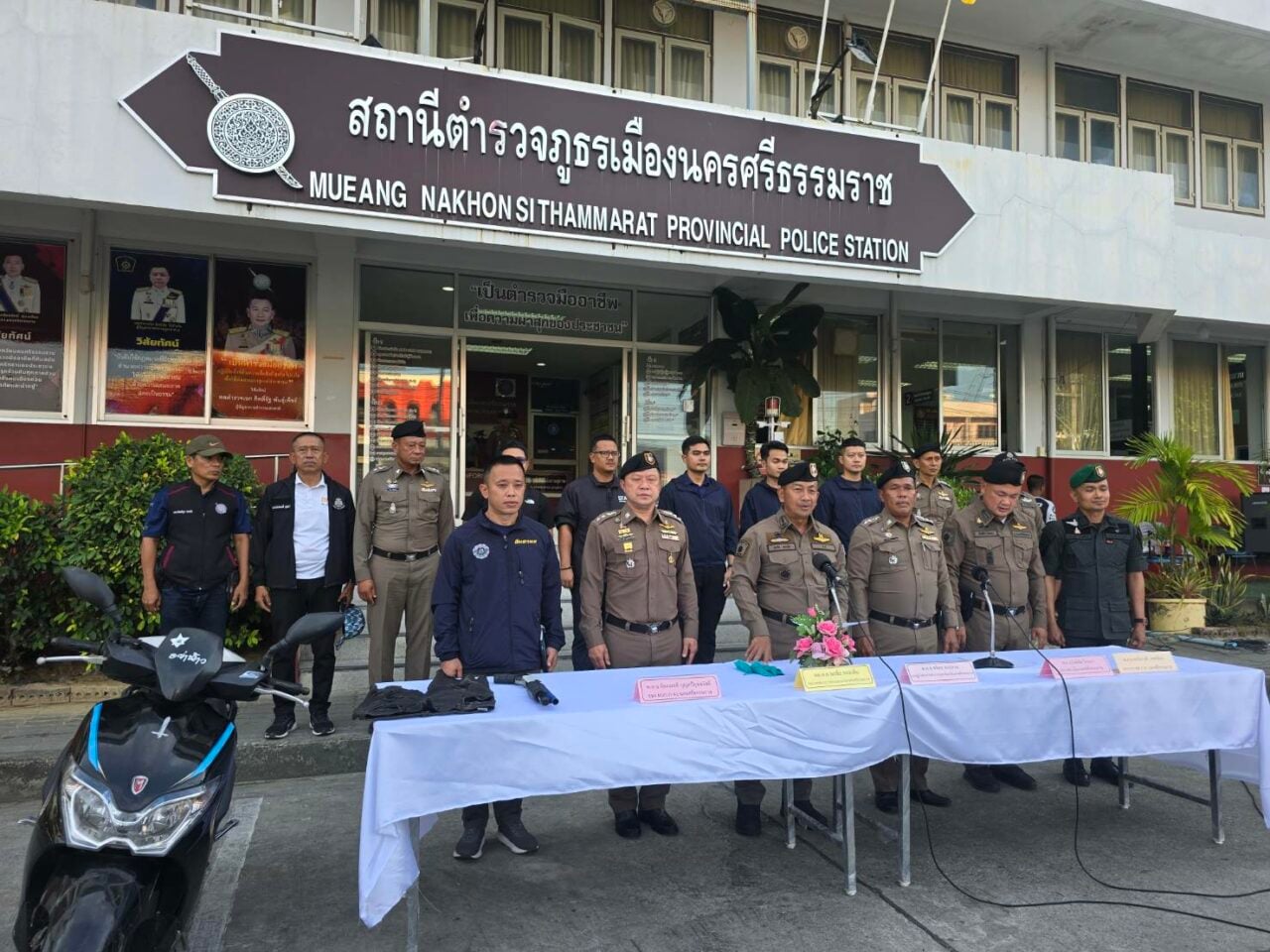 เกี่ยวกับเรื่องนี้ เมื่อวันที่ 2 เม.ย. ผู้สื่อข่าวรายงานว่า เย็นวานนี้ (1 เม.ย.69) ที่ลานหน้า สภ.เมือง จ.นครศรีธรรมราช พล.ต.ต.พรชัย ขจรกลิ่น รองผบช.ภ. 8 พร้อมกำลังตำรวจในสังกัดร่วมกันแถลงจับกุม นายสราวุธ หรือ “บอย ท่าโพธิ์” อายุ 37 ปี มือปืนผู้ก่อเหตุ หลังหลบหนีไปกบดานในป่ามังคุดบนภูเขา อ.ลานสกา พร้อมของกลางอาวุธปืนลูกซองยาว 5 นัด จยย.อฮอนด้า รุ่นมูฟ สีดำ ไม่ติดแผ่นป้ายทะเบียนที่ใช้ขี่หลบหนีในวันเกิดเหตุ โดยแจ้งข้อหา ร่วมกันฆ่าผู้อื่นโดยเจตนาและความผิดตามพรบ.อาวุธปืน