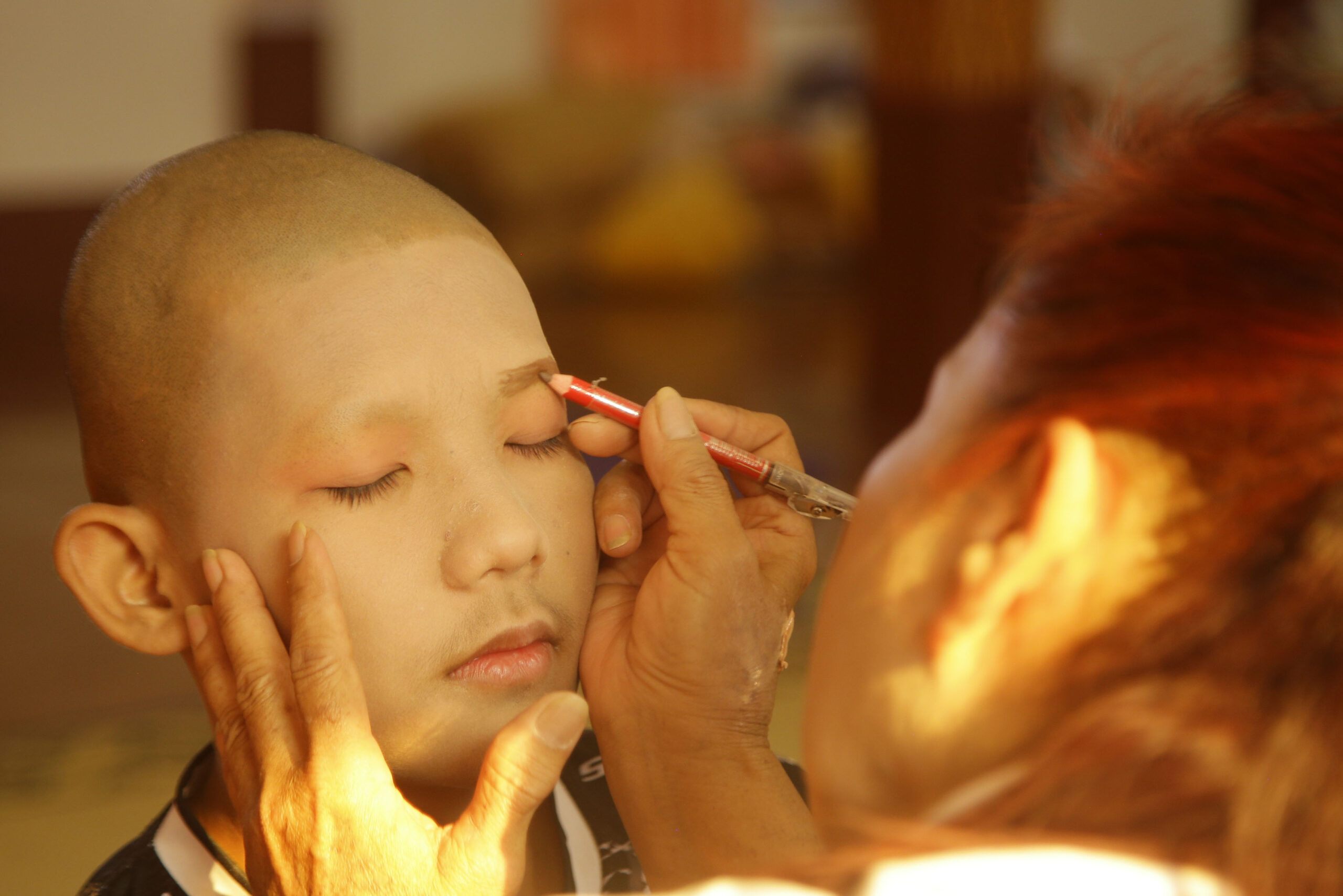 ในจำนวนเด็ก 18 คนที่จะบวชเป็นสามเณร มีเด็ก 6 คน ได้สมัครใจแต่งกายด้วยชุดเทวดา หรือที่ชาวบ้านเรียกว่า “ลูกแก้ว” เริ่มจากชาวบ้านได้ว่าจ้างช่างแต่งหน้ามาแต่งหน้าเด็กทั้ง 6 คน ตั้งแต่ลงแป้ง เขียนคิ้วด้วยสีดำ ทาปากสีแดงสด ใช้เวลาอย่างประณีตบรรจงกว่า 1 ชั่วโมงก็แล้วเสร็จ จากนั้นชาวบ้านและพระสงฆ์ได้ช่วยกันแต่งองค์ทรงเครื่องให้เด็กจำนวนดังกล่าว ให้เป็นเทวดาหรือลูกแก้ว เปลี่ยนเสื้อผ้าจากชุดปกติทั่วไปให้เป็นเสื้อผ้าสีสดใสหลากสีสัน มีเลื่อมและวัสดุสะท้อนแสงปักติดเสื้อผ้ากระทบแสงระยิบระยับ สวมสร้อยสังวาล ประดับประดาข้อมือ ข้อเท้าด้วยกำไล สวมชฎาและสวมแว่นตาสีดำ