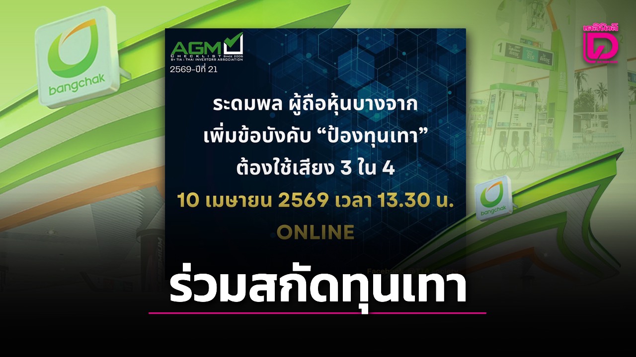 รายงานข่าวจาก สมาคมส่งเสริมผู้ลงทุนไทย (TIA) เปิดเผยว่า สมาคมฯได้ออกประกาศเชิญชวนผู้ถือหุ้นรายย่อยของ บริษัท บางจาก คอร์ปอเรชั่น จำกัด (มหาชน) หรือ บีซีพี เพื่อรวมตัวเข้าประชุมสามัญผู้ถือหุ้นประจำปี ในวันที่ 10 เม.ย.69 นี้ เวลา 13.30 น. ผ่านระบบออนไลน์ เพื่อลงมติวาระสำคัญในการยกระดับธรรมาภิบาล และป้องกันปัญหาทุนสีเทาที่อาจเข้ามาแทรกแซงธุรกิจ