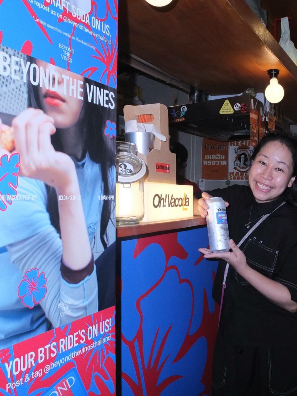 ที่ร้านคราฟท์โซดายอดฮิตย่านทรงวาด Oh! Vacola ถูกเนรมิตในธีมลวดลายดอกไม้ โดยในช่วงวันเสาร์–อาทิตย์ ผู้ที่แวะมาเยี่ยมชมที่ร้าน มีของขวัญสุดพิเศษฟรีๆ เมื่อร่วมกิจกรรมตามเงื่อนไขภายในงาน (ของขวัญมีจํานวนจํากัดในแต่ละวัน) โดยจะได้รับ Crafted Soda ที่เสิร์ฟในกระป๋อง Beyond The Vines (มูลค่า 140 บาท) ไปดื่มให้ชื่นใจ พร้อมรับบัตร BTS Rabbit Card ลายพิเศษจาก Beyond The Vines ที่มีเครดิตการเดินทางมูลค่า 100 บาท ใช้นั่งรถไฟฟ้ากลับบ้านได้เลย