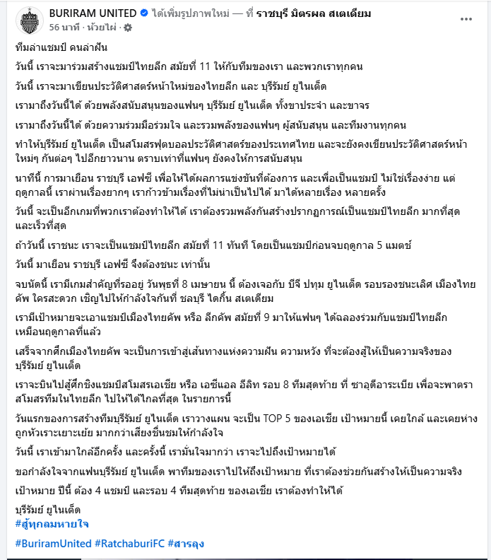 “วันแรกของการสร้างทีมบุรีรัมย์ ยูไนเต็ด เราวางแผน จะเป็น TOP 5 ของเอเชีย เป้าหมายนี้ เคยใกล้ และเคยห่าง ถูกหัวเราะเยาะเย้ย มากกว่าเสียงชื่นชมให้กำลังใจ วันนี้ เราเข้ามาใกล้อีกครั้ง และครั้งนี้ เรามั่นใจมากว่า เราจะไปถึงเป้าหมายได้”