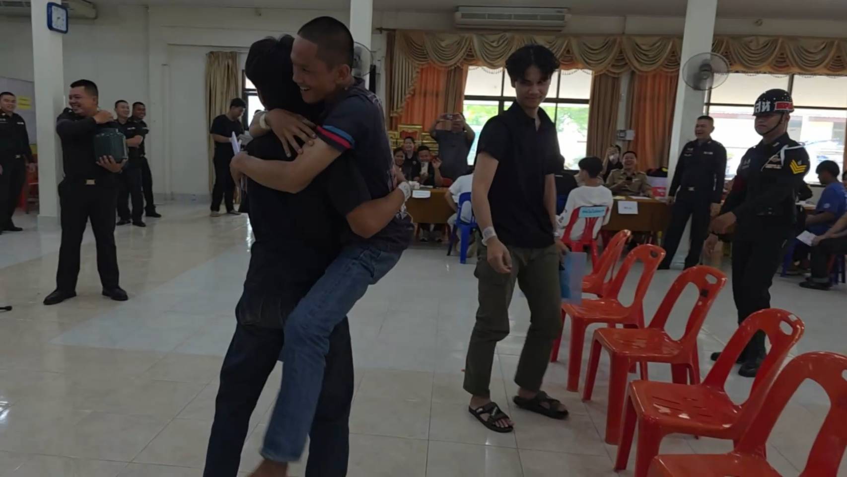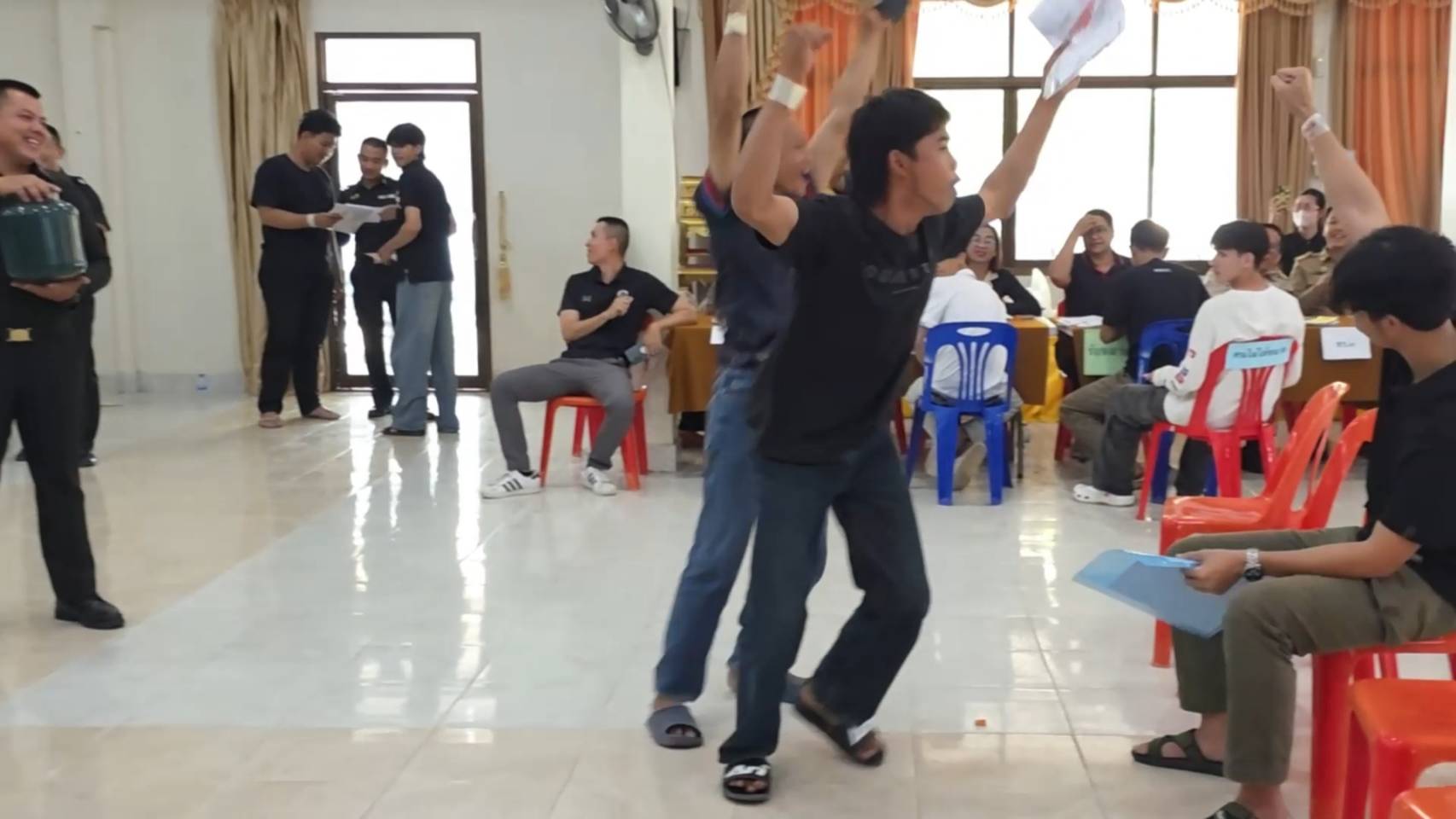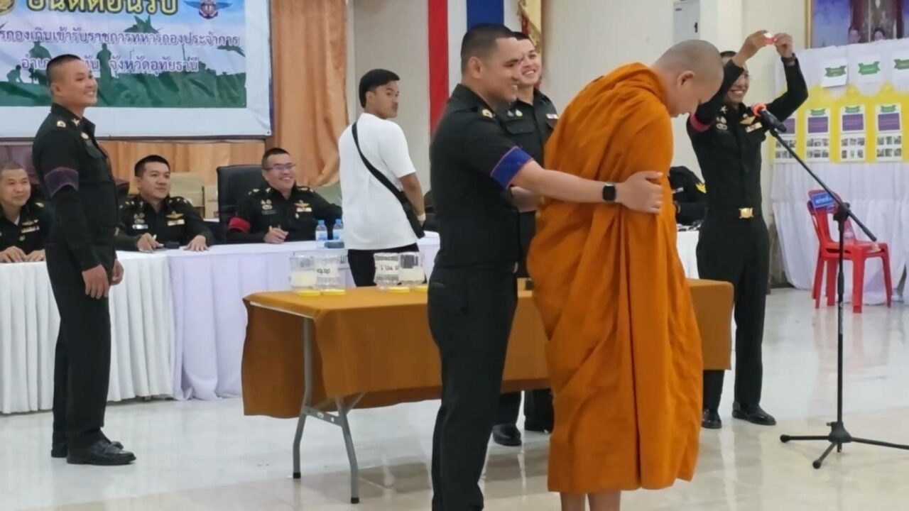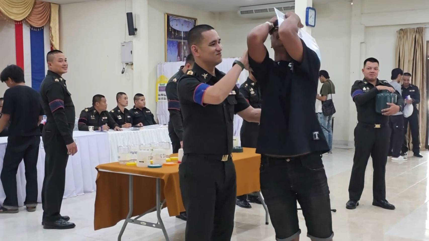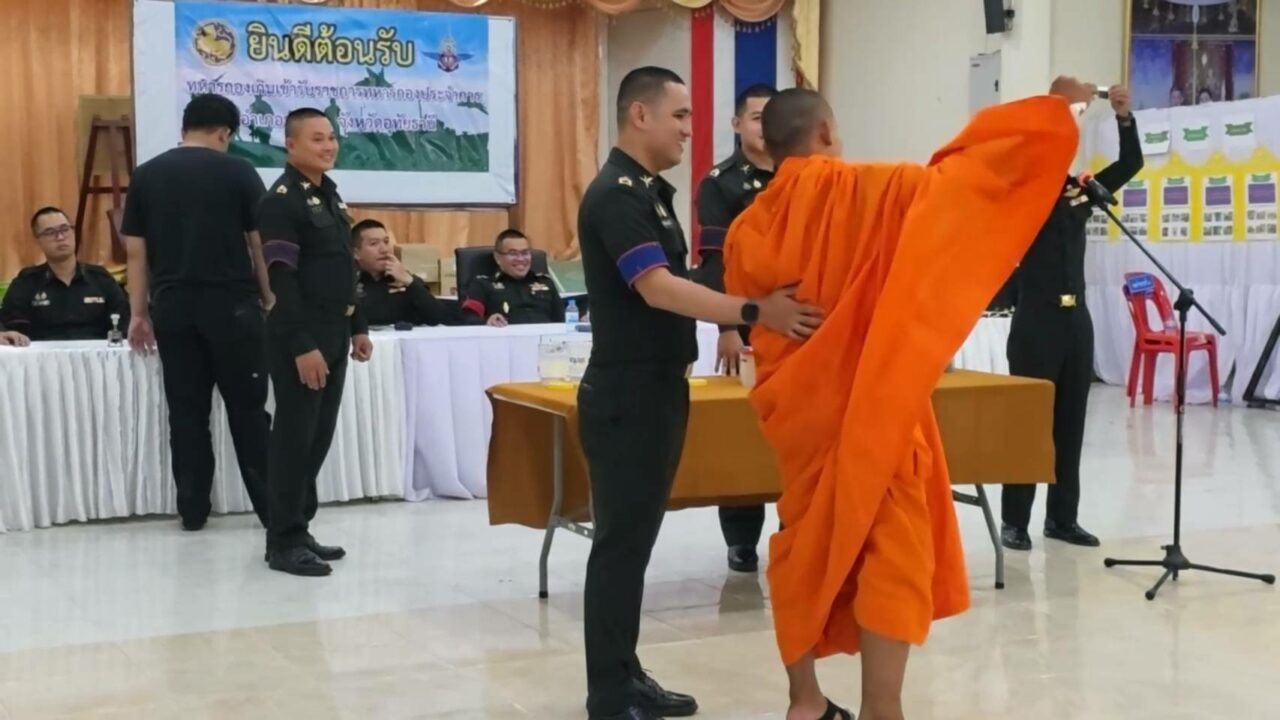 ขณะหนุ่ม ๆ ที่รอจับใบดำใบแดง ขาสั่นกันเป็นแถว ด้านพระภิกษุ 2 รูปที่มาร่วมจับด้วย รูปแรกจับได้ใบดำ คนดูเฮลั่นได้บวชต่อ แต่พออีกรูปจับได้ใบแดง ถึงกับหน้าถอดสี เรียกเสียงฮือฮาไปทั้งห้อง