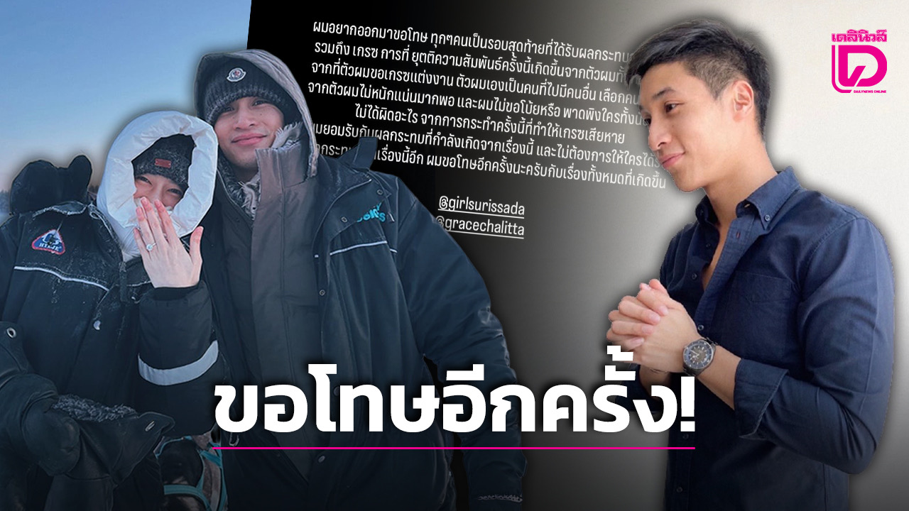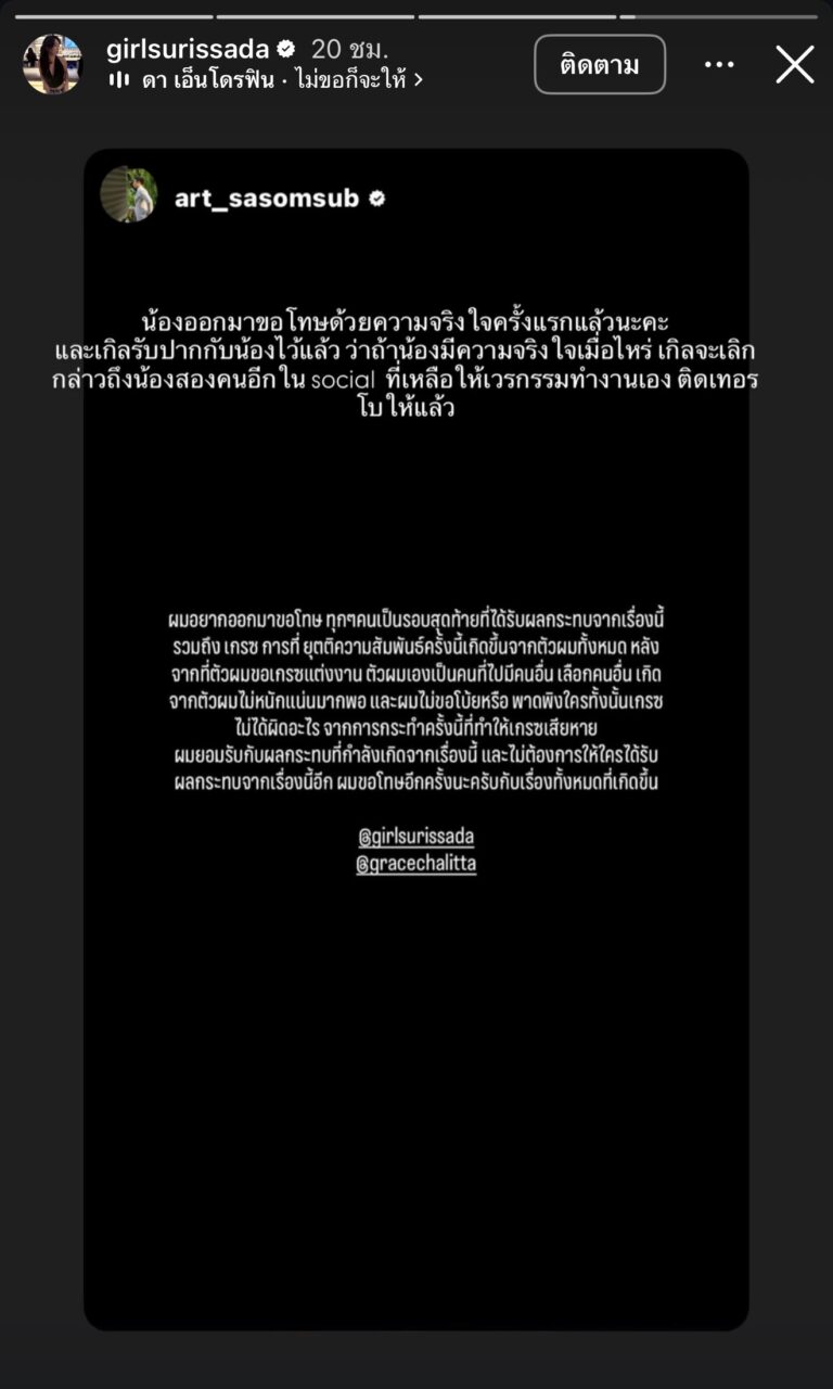 เกรซไม่ได้ผิดอะไร จากการกระทำครั้งนี้ที่ทำให้เกรซเสียหาย ผมยอมรับกับผลกระทบที่กำลังเกิดจากเรื่องนี้ และไม่ต้องการให้ใครได้รับผลกระทบจากเรื่องนี้อีก ผมขอโทษอีกครั้งนะครับกับเรื่องทั้งหมดที่เกิดขึ้น @girlsurissada @gracechalitta” พร้อมแท็กถึงทั้งเกรซและพี่สาว