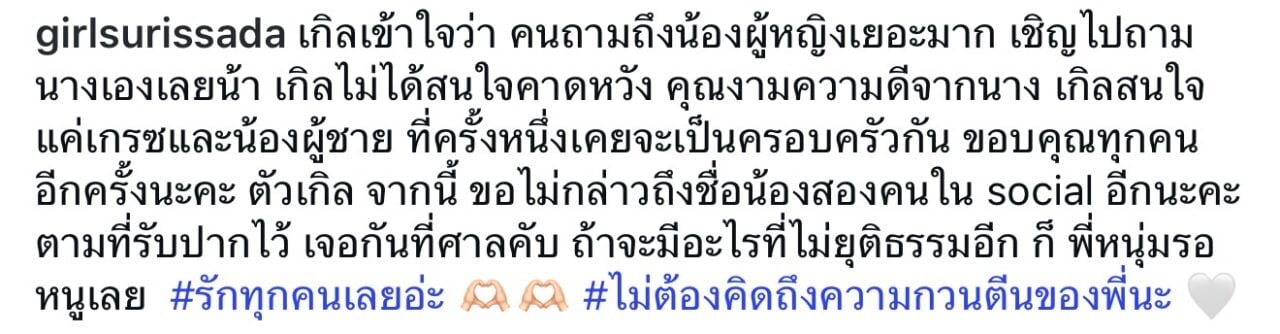 นอกจากนี้เธอยังย้ำชัดอีกครั้งว่า “เกิลเข้าใจว่า คนถามถึงน้องผู้หญิงเยอะมาก เชิญไปถามนางเองเลยน้า เกิลไม่ได้สนใจคาดหวัง คุณงามความดีจากนาง เกิลสนใจแค่เกรซและน้องผู้ชาย ที่ครั้งหนึ่งเคยจะเป็นครอบครัวกัน