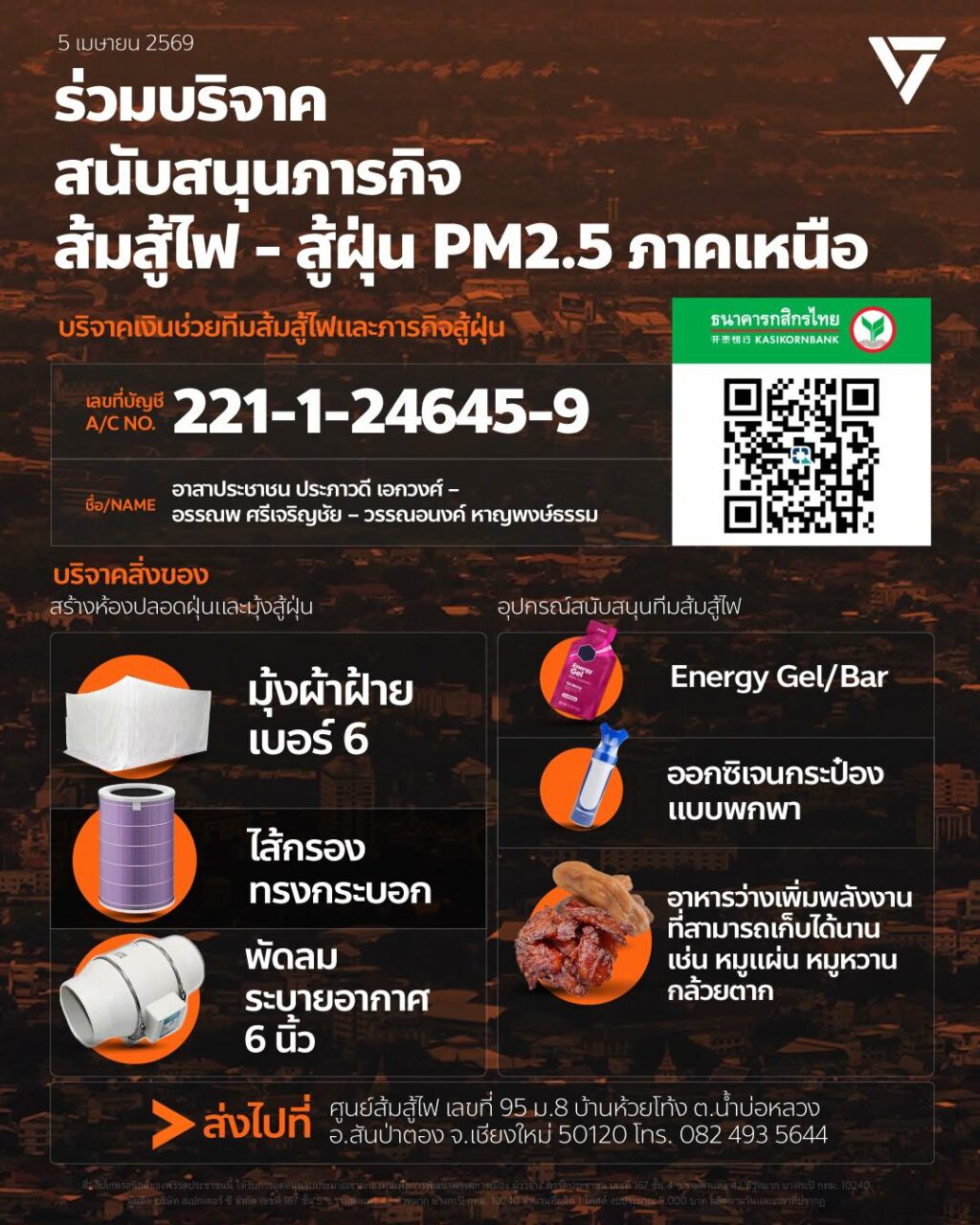 เมื่อวันที่ 5 เม.ย. เพจเฟซบุ๊กพรรคประชาชนประกาศเชิญชวนประชาชนร่วมบริจาคสนับสนุนภารกิจ “ส้มสู้ไฟป่า” และสร้างอุปกรณ์ฟอกอากาศให้กลุ่มเปราะบางภาคเหนือสู้ฝุ่นพีเอ็ม 2.5