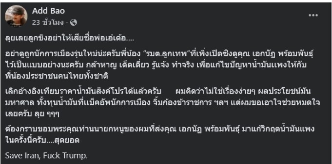 “ต้องกราบขอบพระคุณท่านนายกฯ หนูของผมที่ส่งคุณ เอกนัฏ พร้อมพันธุ์ มาแก้วิกฤติน้ำมันแพงในครั้งนี้ครับ….สุดยอด Save Iran, Fuck Trump.”
