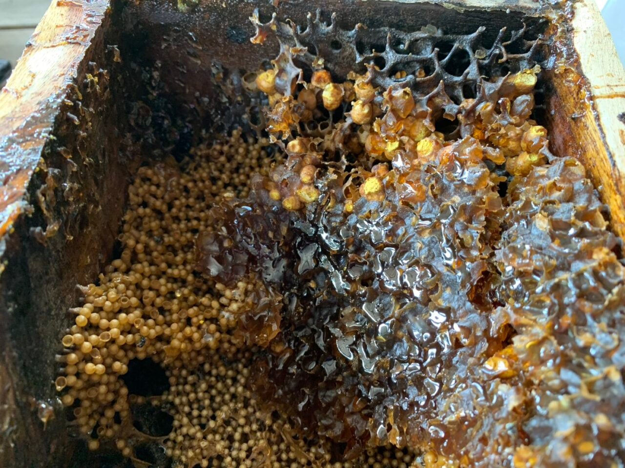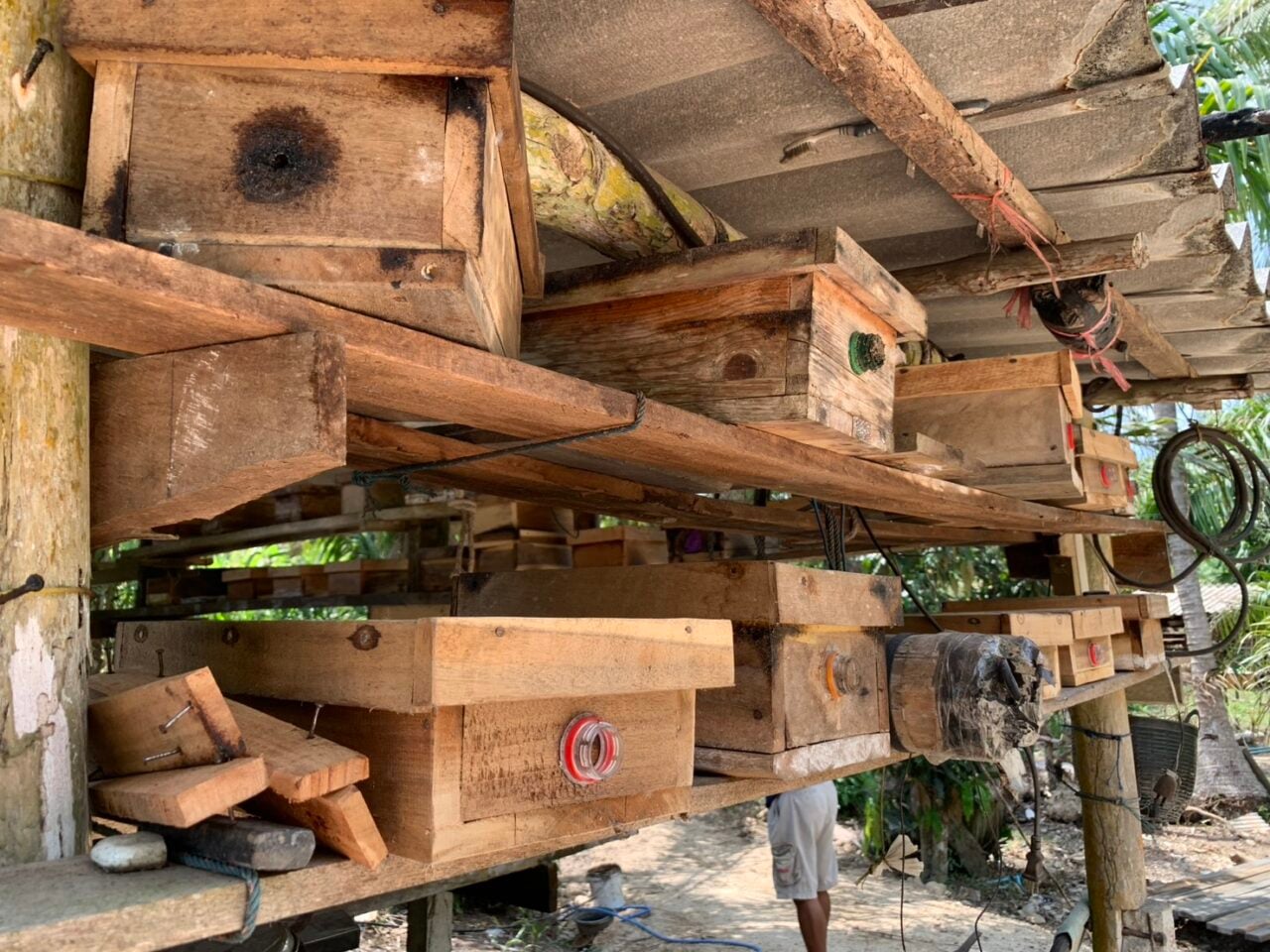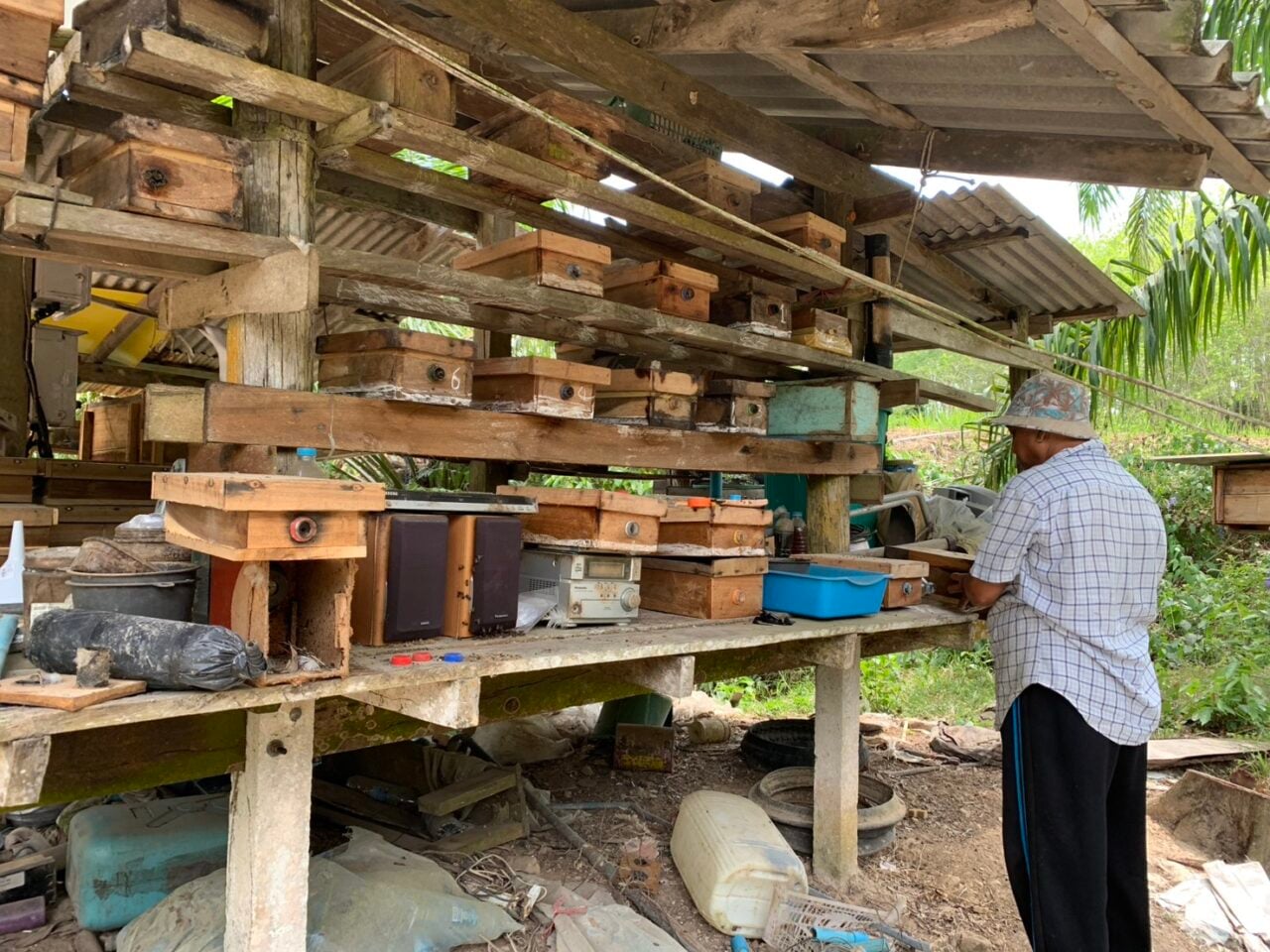 เมื่อวันที่ 6 เม.ย. นายอับดลรักหีม อวนข้อง อายุ 59 ปี เกษตรกรหมู่ที่ 3 ต.บางเป้า อ.กันตัง จ.ตรัง ใช้พื้นที่ว่างบ้าน เลี้ยงผึ้งจิ๋วหรือชันโรง หรือภาคใต้เรียกว่า “อุง” เป็นพันธุ์ขนเงิน เพื่อเก็บน้ำผึ้งขายได้ปีละ 2-3 ครั้ง โดยเฉพาะในช่วงหน้าแล้ง ตั้งแต่เดือนมีนาคม-เมษายนของทุกปี เป็นน้ำผึ้งเดือน 5 ที่ถือว่าดีที่สุดในรอบ 1 ปี เนื่องจากไม่มีน้ำฝนลงมาเจือปน ทำให้น้ำผึ้งมีรสชาติหวาน หอม และเปรี้ยวเล็กน้อยจากเกสรของดอกไม้หลากหลายชนิดที่อยู่ในป่าชายเลนข้างบ้าน