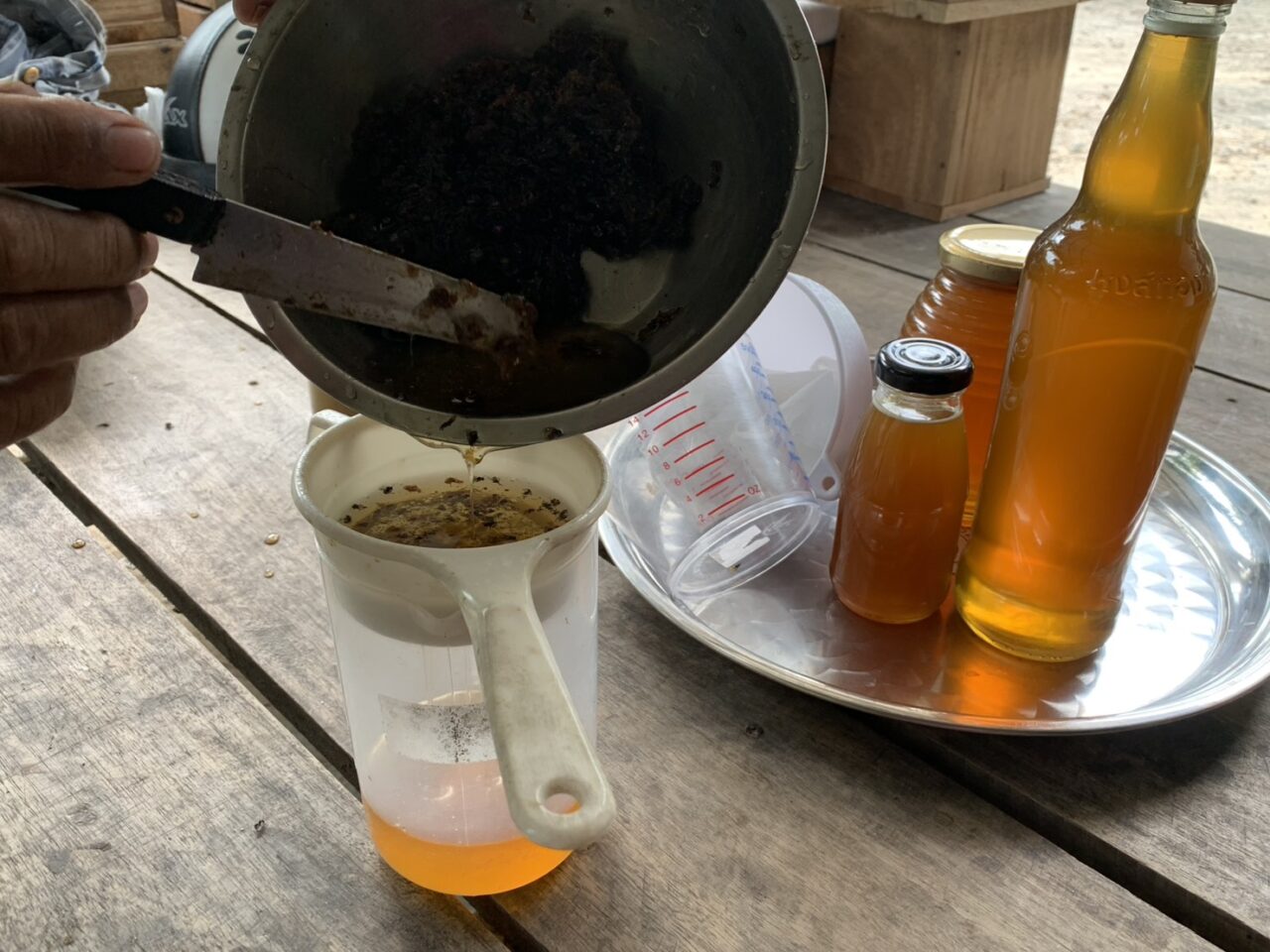 ด้าน นายอับดลรักหีม อวนข้อง เกษตรกรผู้เลี้ยงผึ้งชันโรง กล่าวว่า ตนเลี้ยงผึ้งชันโรงมาประมาณ 4-5 ปี โดยปีนี้คาดว่าจะได้ผลผลิตประมาณ 40,000-50,000 บาท รวมค่าอุปกรณ์การเลี้ยงด้วย ขายน้ำผึ้งเป็นซีซี ซีซีละ 1.50 บาท มีหลายขนาดให้เลือก ช่วงที่น้ำผึ้งขายดีคือช่วงแล้ง คือช่วงเดือนมีนาคม-เมษายน จะมีผลผลิตเยอะ ตอนนี้มีออร์เดอร์ไม่พอขาย ที่เลี้ยงไว้เป็นพันธุ์ขนเงิน มีรสหวานและเปรี้ยวปลาย แหล่งอาหารมาจากดอกมะพร้าว ดอกปาล์ม และดอกหญ้าทุกชนิดใกล้บ้าน.