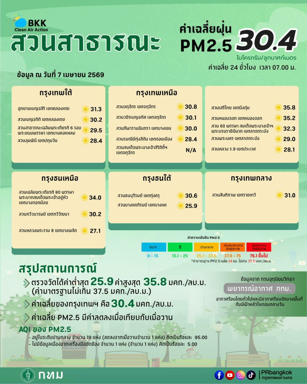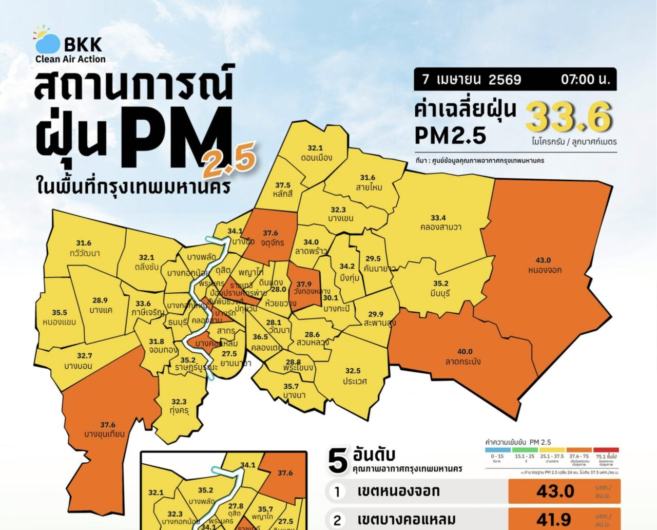 เมื่อเวลา 08.45 น.วันที่ 7 เม.ย. ผู้สื่อข่าวรายงานว่า ทีมโฆษกศูนย์ข้อมูลคุณภาพอากาศกรุงเทพมหานครรายงานสถานการณ์ฝุ่นละอองขนาดไม่เกิน 2.5 ไมครอน (PM 2.5) ของสถานีตรวจวัดคุณภาพอากาศของกรุงเทพมหานคร ประจำวันที่ 7 เม.ย.69 เวลา 07.00 น. ค่าเฉลี่ย 24 ชั่วโมง ของฝุ่นPM2.5