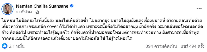 แต่งานนี้หนังคนละม้วน เพราะล่าสุด “น้ำตาล ชลิตา” ของขึ้น ฟาดกลับผ่านเฟซบุ๊กส่วนตัวแบบเจ็บลึกถึงทรวง ยันชัดว่า”ไม่หลบ ไม่ช็อคอะไรทั้งนั้นค่ะ มองไม่เห็นด้วยซ้ำ ไม่อยากยุ่ง ขนาดไม่ยุ่งยังแต่งเรื่องขนาดนี้ ถ้าถ่ายคอนเท้นด้วยเดี๋ยวหาว่าเกาะกระแสอีก cover ก็ไม่ได้ทำแล้ว เพราะฉะนั้นคือไม่ได้อยากยุ่ง ย้ำอีกครั้ง จะมาแอ๊บขอโทษบอกติดค้าง ติดต่อไป เพราะทำอะไรรู้อยู่แก่ใจ กี่ครั้งแล้วที่ปากบอกขอโทษแต่การกระทำสวนทาง ยังสามารถเชื่อคำพูดจากคนแบบนี้ได้อีกเหรอคะ แล้วเดี๋ยวมาบอกไม่ให้อภัย ใช่ ไม่รู้จะให้อะไร