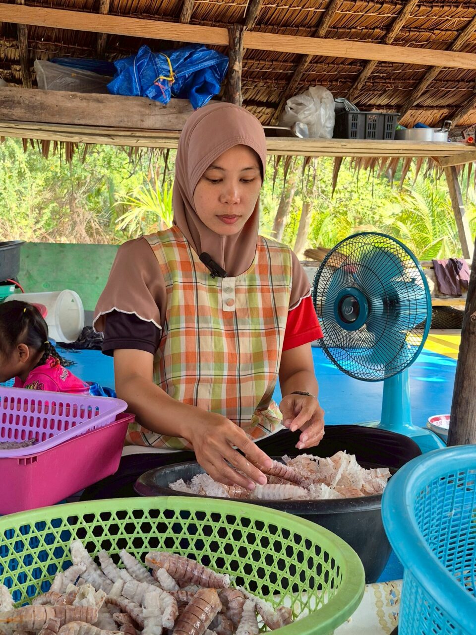 “กั้งที่นี่ได้ชื่อว่าหวานและสด ร้านอาหารจะมารับไปทำเมนูยอดฮิตอย่าง กั้งทอดกระเทียม ข้าวผัดกั้ง หรือกะเพรากั้ง นอกจากนี้เรายังใส่ใจเรื่องสิ่งแวดล้อม เปลือกกั้งที่เหลือจากการแกะจะไม่ถูกทิ้งเป็นขยะ แต่จะมีลูกค้ามารับซื้อไปทำปุ๋ยบำรุงต้นปาล์มน้ำมันต่อ ซึ่งให้ธาตุอาหารที่ดีมาก” นางสาวรอสนา กล่าว