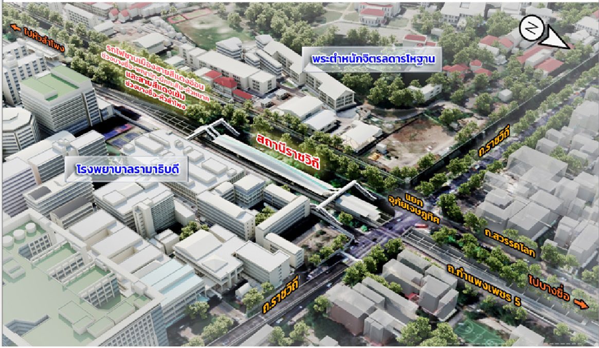 เนื่องจากได้ปรับย้ายตำแหน่งสถานีราชเทวี จากด้านทิศเหนือของแยกอุทัยเจษฎทิศ มาด้านทิศใต้ของแยกอุทัยเจษฎทิศ ใกล้รพ.รามาธิบดีมากขึ้น ห่างจุดเดิม 100-200 เมตร และมีทางเดินลอยฟ้า(สกายวอล์ก) จากสถานีเชื่อมเข้าสู่อาคารรพ.พร้อมปรับชื่อสถานีราชวิถี เป็นสถานีรามาธิบดี