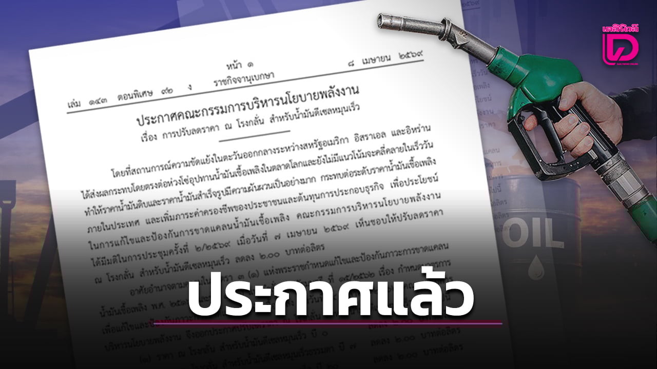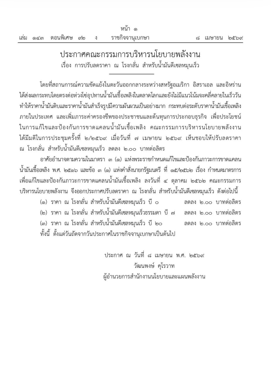 เมื่อวันที่ 8 เมษายน 2569 เว็บไซต์ราชกิจจานุเบกษา เผยแพร่ ประกาศคณะกรรมการบริหารนโยบายพลังงาน เรื่อง การปรับลดราคา ณ โรงกลั่น สำหรับน้ำมันดีเซลหมุนเร็ว ความว่า