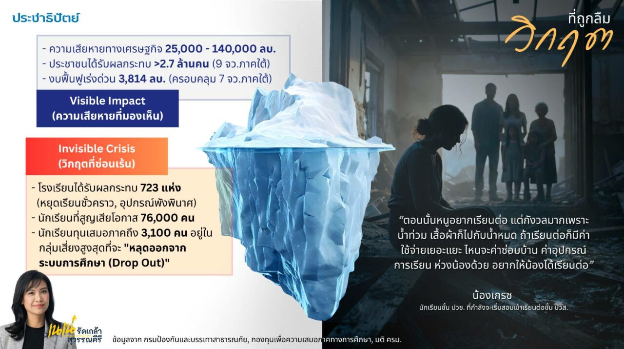 เมื่อวันที่ 8 เม.ย. ที่รัฐสภา ในการประชุมสภาผู้แทนราษฎร ได้มีการอภิปรายในญัตติปฏิรูปโครงสร้างการบริหารจัดการอุทกภัยแบบบูรณาการ (หาดใหญ่โมเดล) เพื่อการเฝ้าระวัง ป้องกัน และฟื้นฟูเศรษฐกิจหาดใหญ่อย่างยั่งยืน นางรัดเกล้า อินทวงศ์ สุวรรณคีรี สส.บัญชีรายชื่อ พรรคประชาธิปัตย์ ได้หยิบยก “วิกฤติการศึกษา” ที่เป็นประเด็นถูกลืม และแทบไม่มีใครพูดถึง เปรียบเหมือน “ภูเขาน้ำแข็งใต้น้ำ” ที่กำลังกระทบอนาคตเด็กไทยอย่างเงียบ ๆ แต่ รัฐบาลกลับมองข้าม