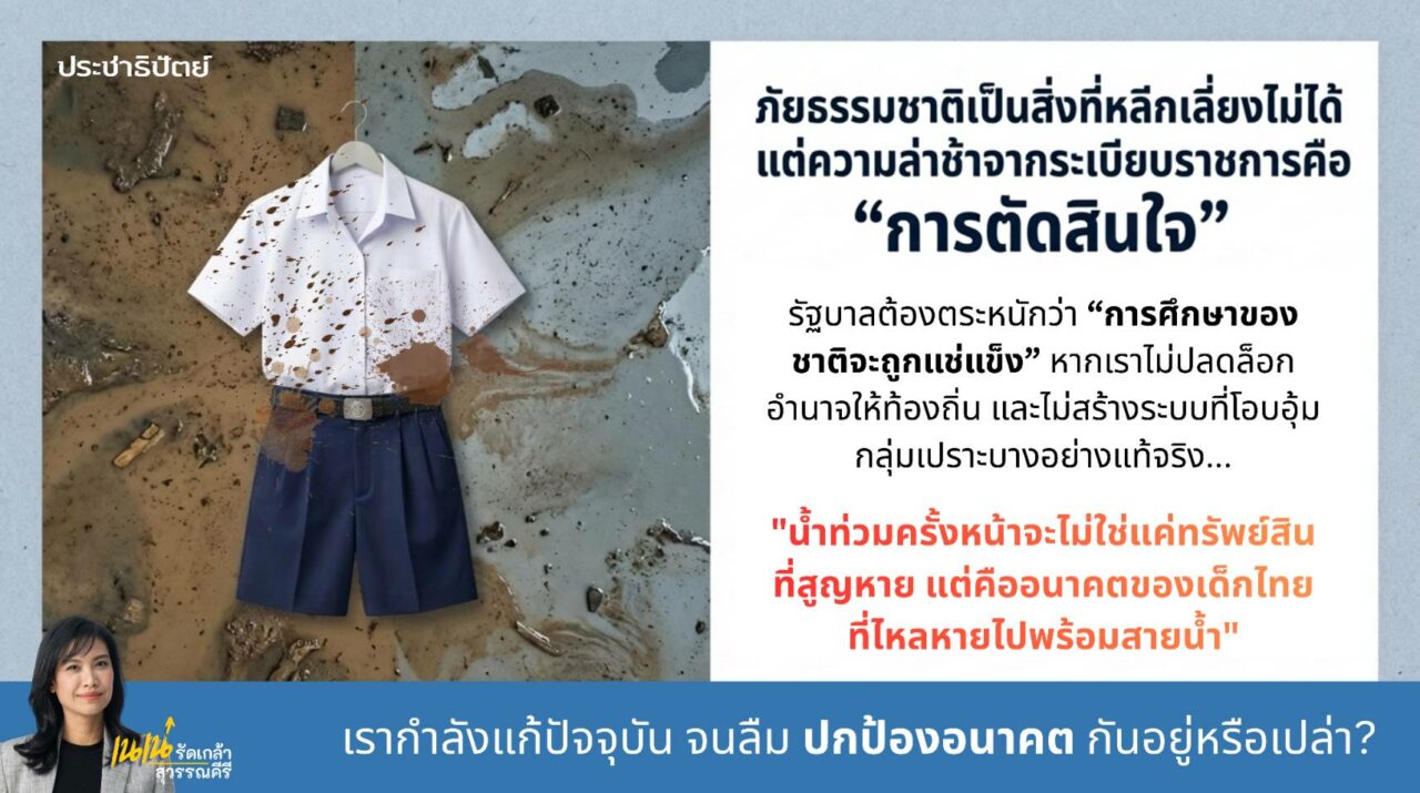 “น้ำท่วมจบได้ แต่อนาคตเด็กไทยจบไม่ได้ – ภัยธรรมชาติเราอาจห้ามไม่ได้ แต่ความล่าช้าจากระบบราชการ คือการตัดสินใจของฝ่ายบริหาร และรัฐบาลต้องรับผิดชอบ” นางรัดเกล้ากล่าว พร้อมทิ้งท้ายว่า หากยังไม่เร่งปลดล็อกโครงสร้างและกระจายอำนาจให้ท้องถิ่นอย่างแท้จริง น้ำท่วมครั้งต่อไปจะไม่ใช่แค่ความเสียหายทางเศรษฐกิจ แต่จะหมายถึง “อนาคตของเด็กไทยที่ไหลหายไปกับสายน้ำ”