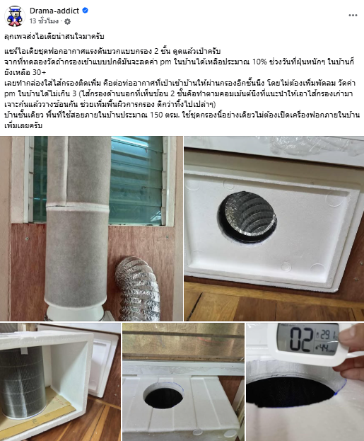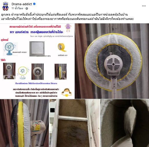 โดยเพจ Drama-addict ระบุข้อความว่า “ลูกเพจฝากมาครับอันนี้ เขาประยุกต์ใช้แผ่นฟิลเตอร์ กับพวกพัดลมและแอร์ในการช่วยลดฝุ่นในบ้าน เอาจริงๆ มันก็ไม่เวิร์กเท่าใช้เครื่องกรองอากาศ หรือห้องแรงดันหรอกแต่ถ้ามันไม่มีจริงๆ ก็คงต้องทำแหละ”